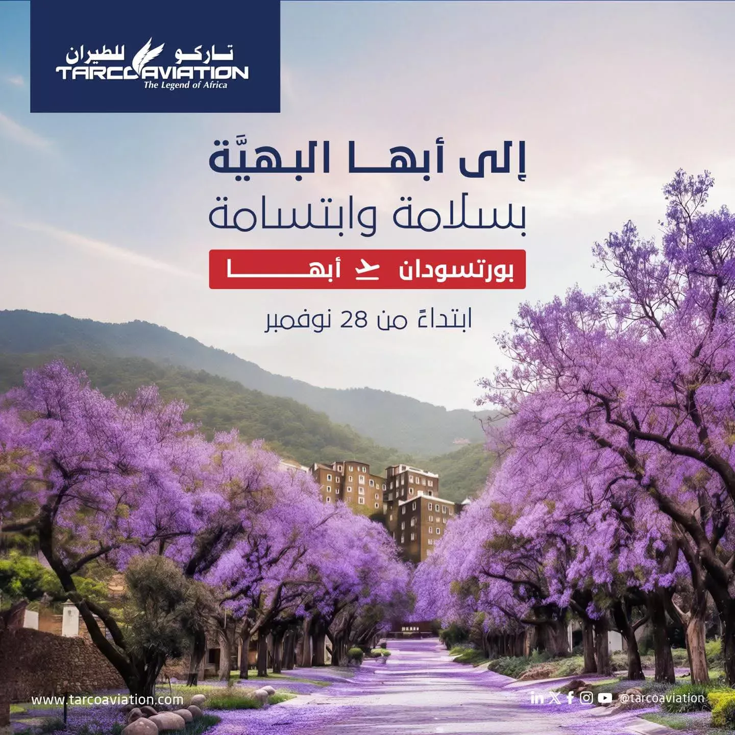أعلنت شركة تاركو الطيران عن تسيير رحلات جوية مباشرة من بورتسودان إلي أبها بجنوب المملكة العربية السعودية وذلك إعتباراً من 28 نوفمبر الجاري.