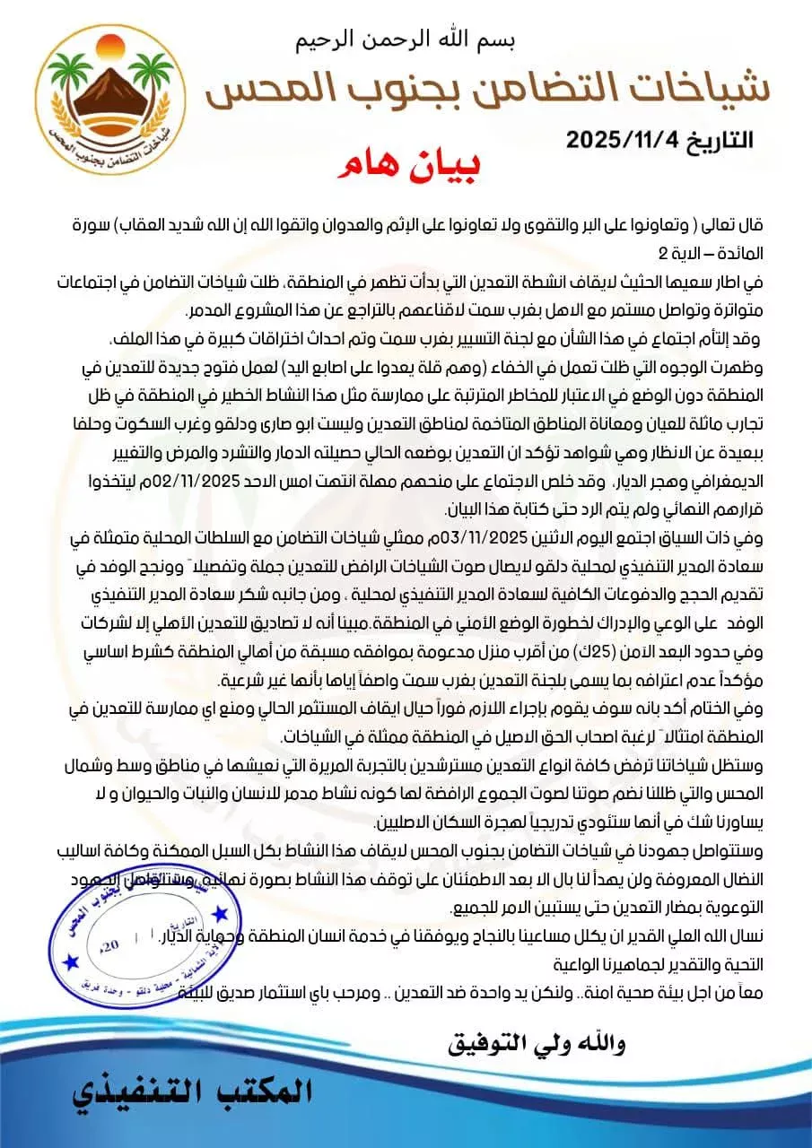 أعلنت شياخات المحس أن السلطات المحلية وافقت علي إيقاف الأنشطة التعدينية في مناطقها وقالت في بيان أصدرته اليوم الثلاثاء أن إختراقات كبيرة حدثت في هذا الملف بغرض إيقاف أي نشاط تعديني في المنطقة نظراً لأضراره علي الإنسان وتأثيراته الضارة للنبات والحيوان والبيئة.