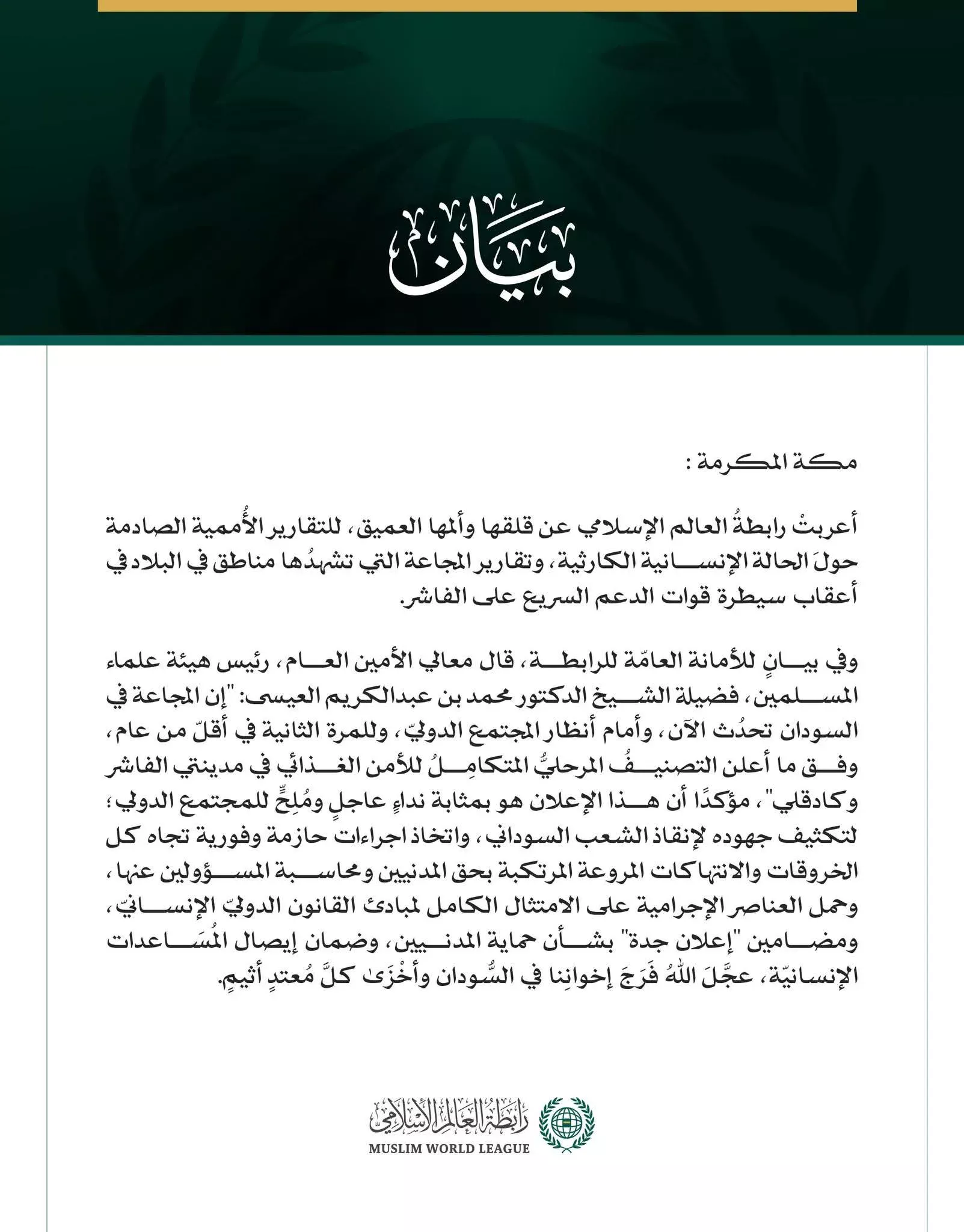 أعربت رابطة العالم الإسلامي عن بالغ قلقها بسبب التقارير التي تتحدث عن الأوضاع الكارثية والمجاعة التي تحدث في عدد من مناطق البلاد خاصة بعد سيطرة الدعم السريع علي الفاشر مؤخراً وقال الأمين العام للرابطة محمد العيسي في بيان عاجل الرابطة أن المجاعة تحدث الآن في السودان وللمرة الثانية خلال عام .