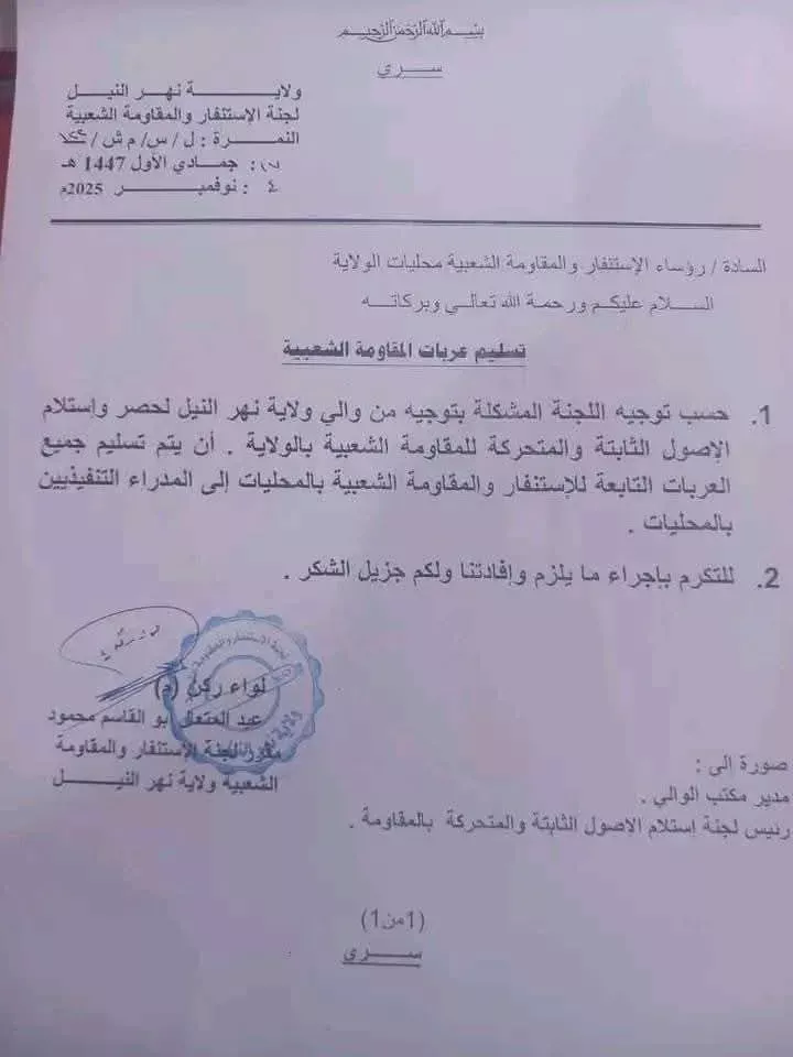 بدأت المقاومة الشعبية في ولاية نهر النيل بتنفيذ توجيه والي الولاية محمد البدوي عبد الماجد الخاص بتسليم العُهد والأصول الثابتة والمتحركة للمديرين التنفيذيين بالمحليات ووجهت لجنة الإستنفار والمقاومة الشعبية رؤساء لجانها بمحليات الولاية المختلفة بتنفيذ القرار وإجراء اللازم بتسليم العربات.