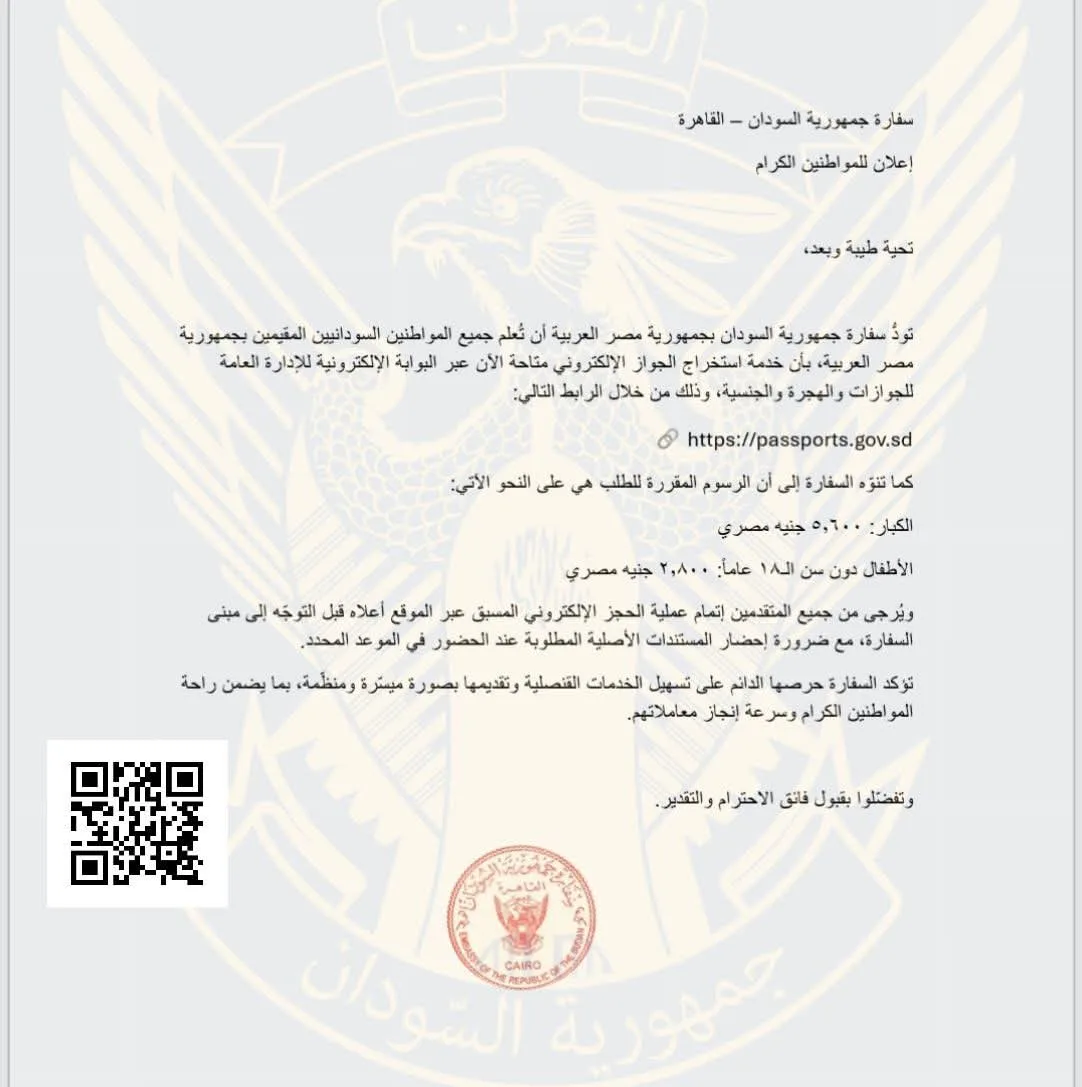 السفارة السودانية بالقاهرة تحدد مبلغ 5600 جنيه مصري كرسوم لإستخراج الجواز للسودانيين بمصر