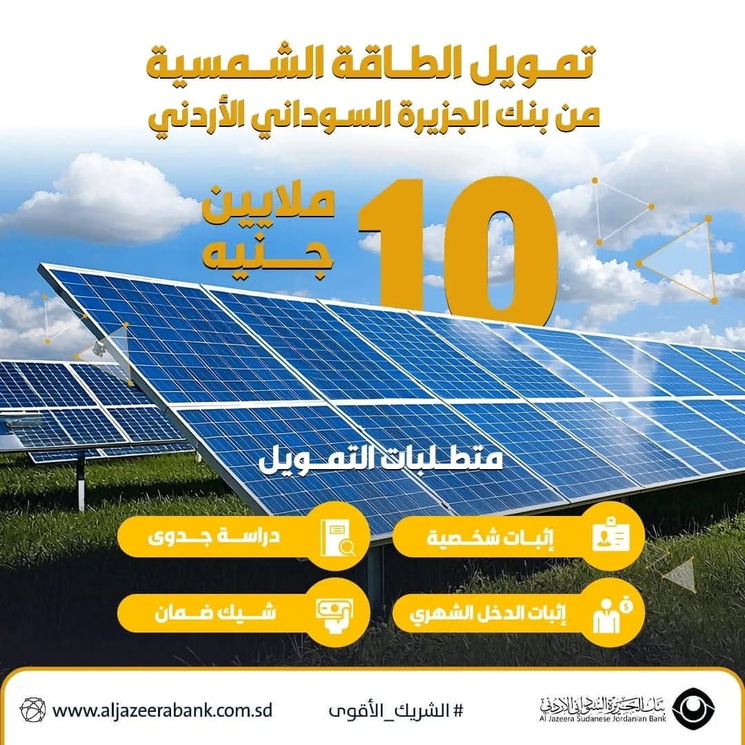 بنك الجزيرة السوداني الأردني يطلق تمويل الطاقة الشمسية دعماً للأفراد والمحلات الصغيرة