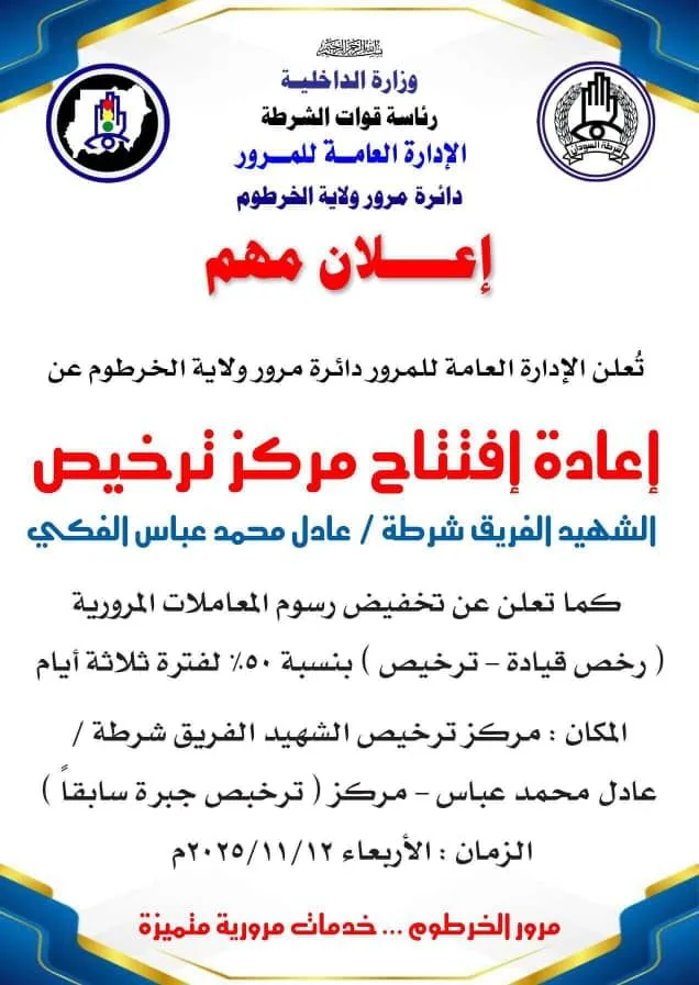 الرئيسية/محلية/إدارة مرور ولاية الخرطوم تعلن عن إعادة افتتاح مركز ترخيص جبرة ابتداءً من اليوم مع تخفيض رسوم المعاملات المرورية بنسبة 50% لمدة ثلاثة أيام محلية أخر الأخبار إدارة مرور ولاية الخرطوم تعلن عن إعادة افتتاح مركز ترخيص جبرة ابتداءً من اليوم مع تخفيض رسوم المعاملات المرورية بنسبة 50% لمدة ثلاثة أيام Alhadiمنذ 3 أسابيع0 535 أقل من دقيقة الوسوم#إدارة مرور ولاية الخرطوم نسخ الرابط تم نسخ الرابط Alhadiمنذ 3 أسابيع0 535 أقل من دقيقة شاركها فيسبوك X ماسنجر ماسنجر واتساب تيلقرام