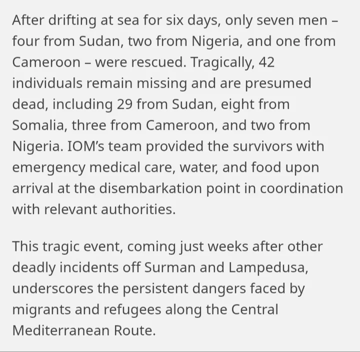 كشفت منظمة الدولية للهجرة عن تفاصيل جديدة بشأن حادثة غرق قارب قبالة السواحل الليبية وأعلنت عن فقدان 29 سودانياً اليوم وسط البحر المتوسط من بين 42 مهاجراً يُعتقد أنهم لقوا حتفهم بعد غرق قاربهم المطاطي الذي أبحر من سواحل مدينة زوارة في ليبيا وعلى متنه 49 مهاجراً، وإنقاذ 7 مهاجرين، 4 من السودان، و 2 من نيجيريا، وواحد من الكاميرون.