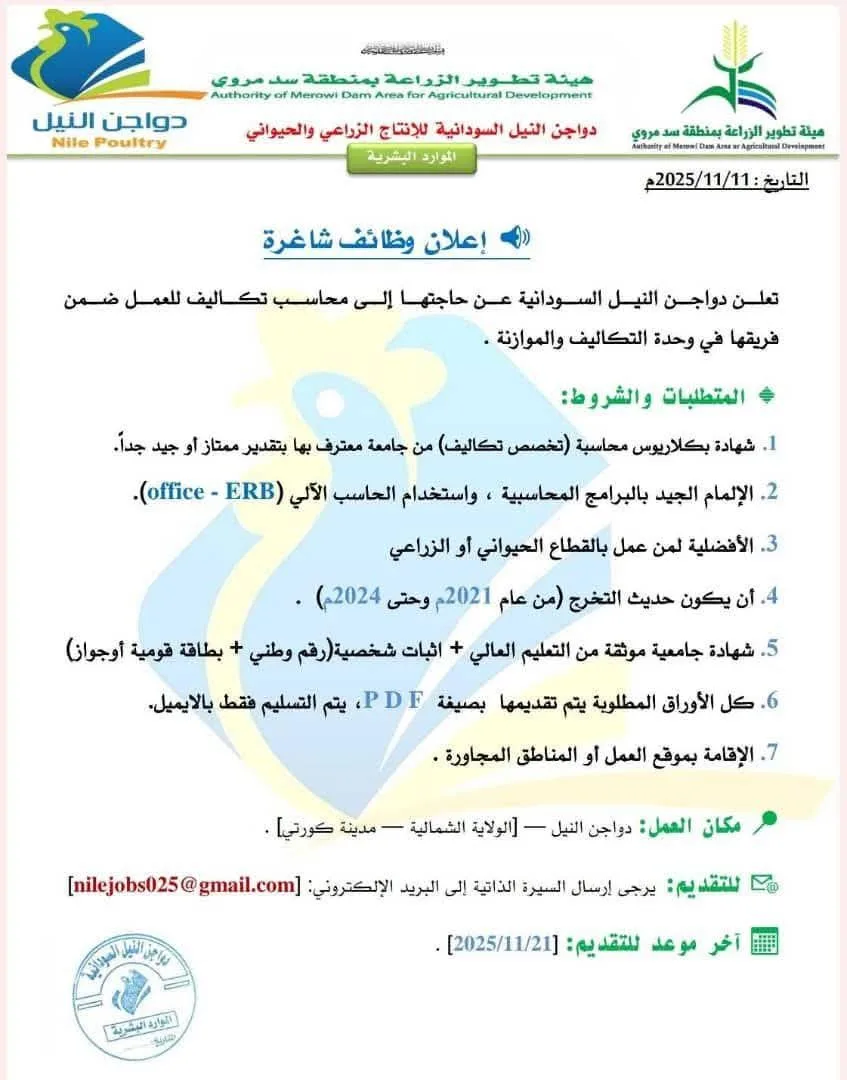 تعلن شركة دواجن النيل السودانية عن حاجتها لـ محاسب تكاليف للعمل ضمن فريقها في وحدة التكاليف والموازنة ، للتقديم: إرسال السيرة الذاتية على البريد الإلكتروني: nilejobs025@gmail.comآ ونوهت الشركة أن آخر موعد للتقديم يوم 21 نوفمبر 2025م .