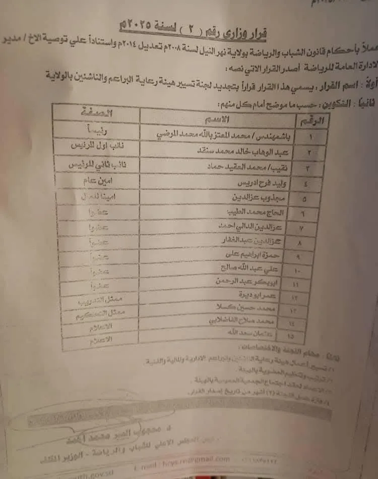 أصدر وزير الشباب والرياضة بولاية نهر النيل محجوب السر، قراراً بتجديد لجنة تسيير هيئة رعاية البراعم والناشئين بالولاية ، وسمى القرار محمد المعتز بالله محمد المرضي، رئيساً ، وعبدالوهاب خالد محمد سنقد، نائباً أول للرئيس، نقيب محمد العقيد حماد، نائباً للرئيس، ووليد فرح إدريس أميناً عاماً .