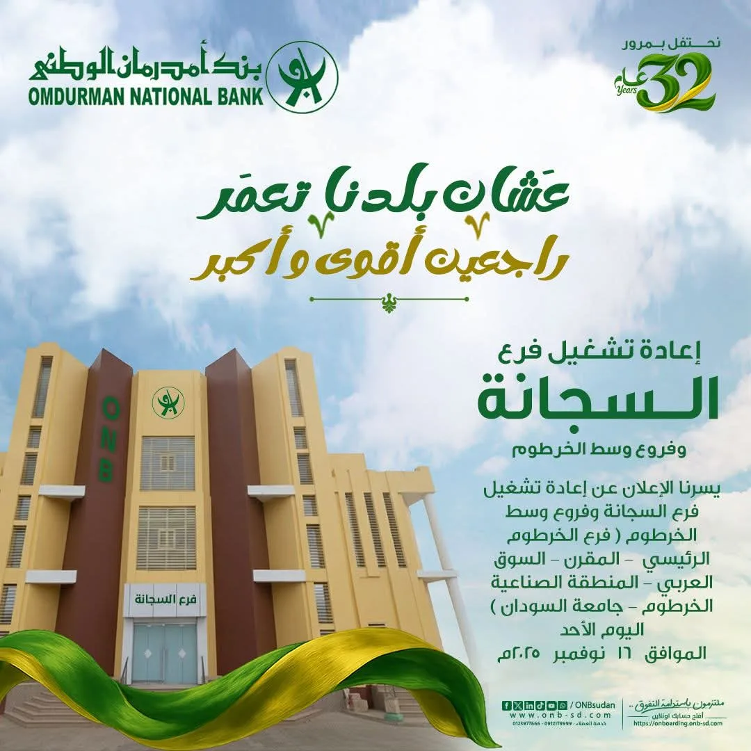 أعلن بنك أم درمان الوطني عن إعادة إفتتاح 6 فروع له بالخرطوم مؤكداً تشغيل فروعه في (السجانة، الفرع الرئيس بالخرطوم، المقرن، السوق العربي، المنطقة الصناعية بالخرطوم وفرع جامعة السودان للعلوم والتكنولوجيا) وقال البنك إن جميع فروعه باشرت عملها منذ أمس الأحد.
