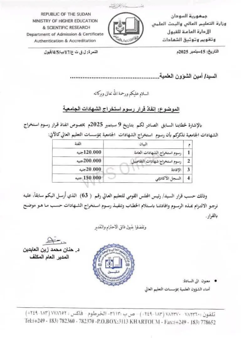 أعلنت وزارة التعليم العالي والبحث العلمي عبر الإدارة العامة للقبول وتقويم وتوثيق الشهادات ، عن الرسوم الجديدة لاستخراج الشهادات الجامعية بمؤسسات التعليم العالي وحددت الرسوم المعتمدة بواقع 120 ألف جنيه للشهادات العامة و 200 ألف جنيه التفاصيل و 120 ألف جنيه للسجل الأكاديمي و 20 ألف جنيه للإفادة وأكدت الوزارة في تعميمها إلى أمناء الشؤون العلمية بالجامعات ضرورة الالتزام بتطبيق القرار وتنفيذ الرسوم وفق ما تم تحديده ، مع موافاتها بتأكيد الاستلام والتنفيذ.