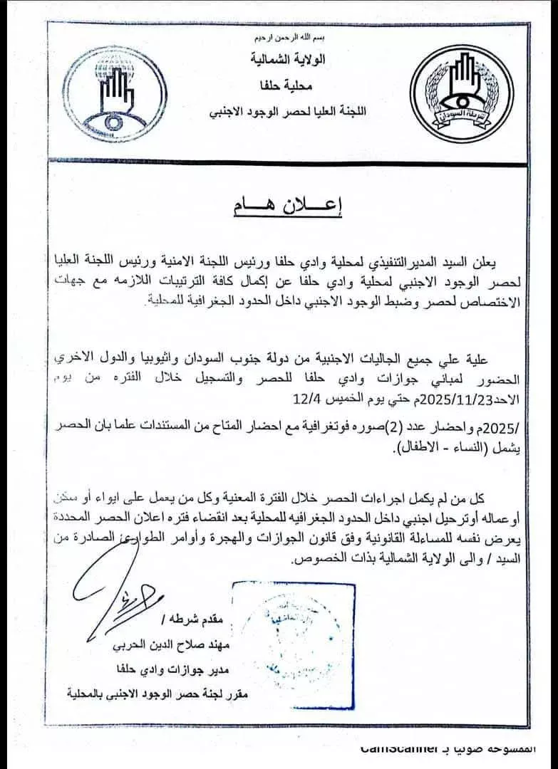 أعلنت السلطات المحلية بوادي حلفا عن إكتمال الترتيبات الخاصة بحصر وتسجيل الأجانب ودعت لجنة حصر الوجود الأجنبي الوافدين من جنوب السودان وإثيوبيا والجنسيات الأخري للحضور إلي مركز الحصر والتسجيل بمباني إدارة الجوازات بمدينة وادي حلفا في الفترة من 23 نوفمبر الجاري وحتي 4 ديسمبر المقبل ولوحت اللجنة بإتخاذ الإجراءات القانونية المخالفين بعد نهاية فترة التسجيل وشددت أن كل من يعمل علي إيواء أو تسكين أو عمالة بعد إنقضاء المدة المقررة قانوناً سيعرض نفسه للمساءلة.