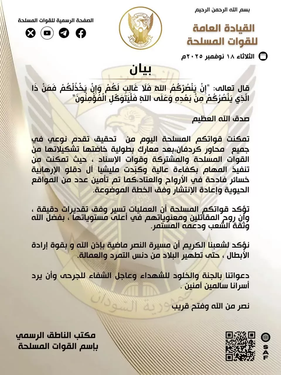 تمكنت قواتكم المسلحة اليوم من تحقيق تقدم نوعي في جميع محاور كردفان، بعد معارك بطولية خاضتها تشكيلاتها من القوات المسلحة والمشتركة وقوات الإسناد، حيث تمكنت من تنفيذ المهام بكفاءة عالية وكبّدت مليشيا آل دقلو الإرهابية خسائر فادحة في الأرواح والعتاد، كما تم تأمين عدد من المواقع الحيوية وإعادة الإنتشار وفق الخطة الموضوعة.