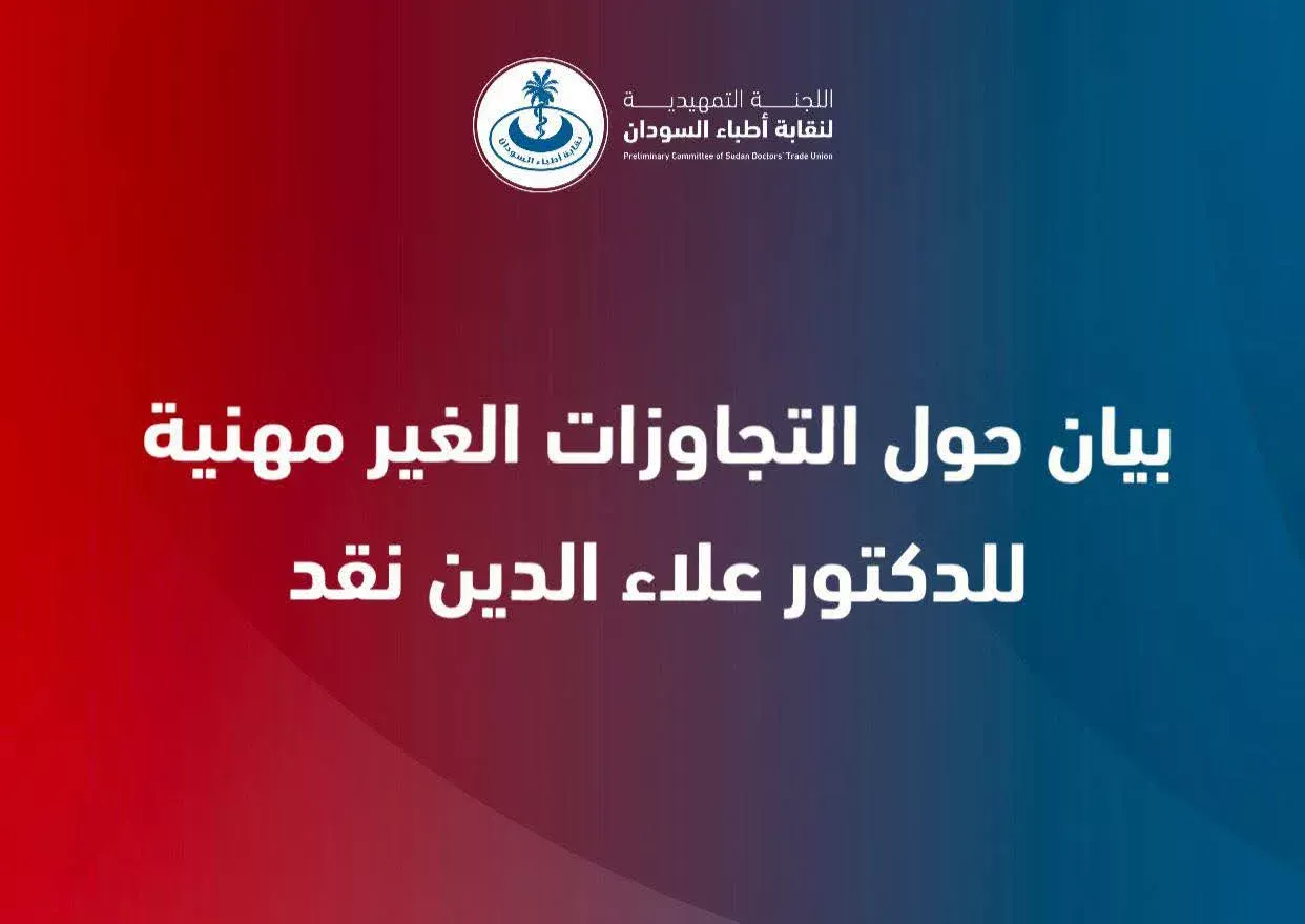 انطلاقًا من مسؤوليتنا التاريخية والأخلاقية تجاه شعبنا، والتزامًا بقسم أبقراط ومبادئ المهنة التي جعلت من الطبيب حارسًا للحياة وكرامة الإنسان، تُعلن اللجنة التمهيدية لنقابة أطباء السودان عن موقف واضح لا لبس فيه تجاه ما صدر عن الطبيب علاء الدين نقد من تصريحات وممارسات تتنافى مع أخلاقيات المهنة ومع قيم المجتمع الطبي.