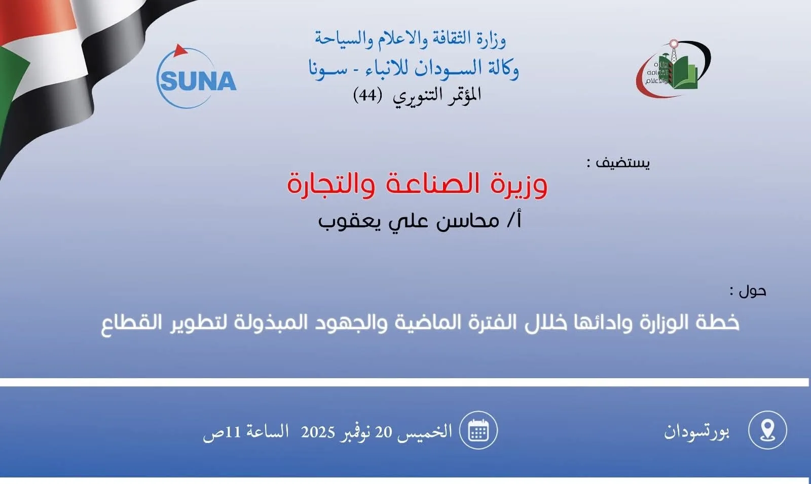 يستضيف المؤتمر التنويري رقم 44 لوزارة الثقافة والإعلام والسياحة الذي تنظمه وكالة السودان للأنباء في الحادية عشرة من صباح اليوم الخميس وزيرة الصناعة والتجارة الأستاذة محاسن علي يعقوب ويتناول المؤتمر اداء الوزارة وخطتها خلال الفترة الماضية والجهود المبذولة لتطوير القطاع.