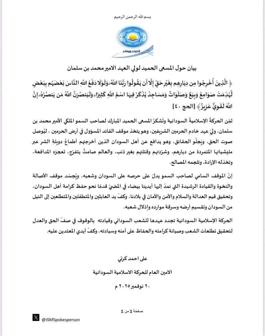ثمِّن الحركةُ الإسلاميةُ السودانية وتَشكرُ المسعى الحميد المبارك لصاحب السمو الملكي الأمير محمد بن سلمان، وليِّ عهد خادم الحرمين الشريفين، وهو يتخذ موقف القائد المسؤول في أرض الحرمين ، ليُوصل صوت الحق، ويَجلُو الحقائق، وهو يدافع عن أهل السودان الذين أخرجتهم أطماعُ دويلةِ الشر عبر مليشياتها المتمردة من ديارهم، وشرّدتهم وقتلتهم بغير ذنب، والعالم صامتٌ يتفرّج، تعجزه المدافعة، وتخذله الإرادة، وتلجمه المصالح.