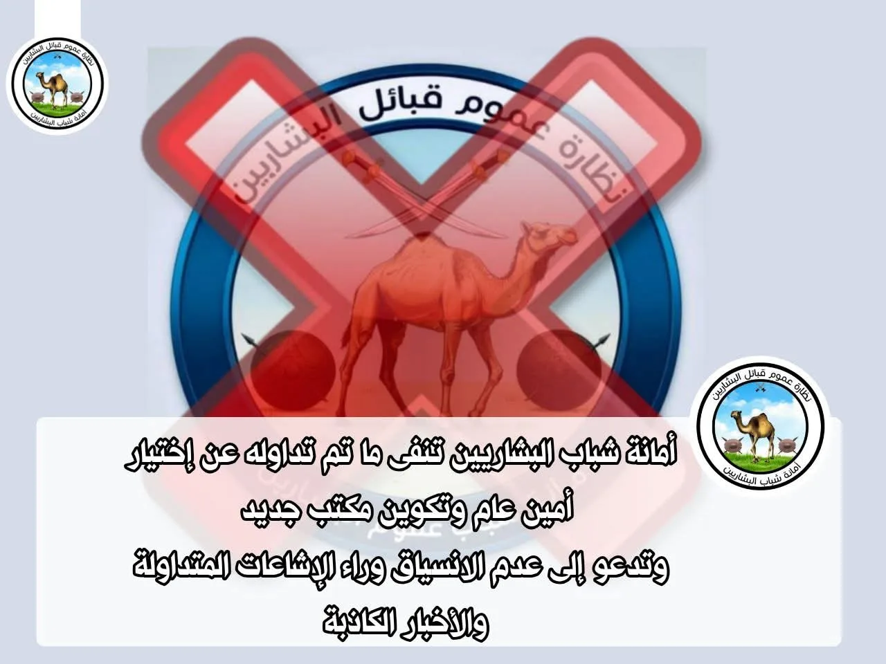 نفي مكتب شباب البشاريين الأخبار المتداولة علي نطاق واسع في مواقع التواصل الإجتماعي بشأن تكون مكتب جديد واعتبر ما تردد مؤخراً بتشكيل مكتب جديد إشاعات مغرضة واستنكر المكتب الأنباء المتداولة حول تكوين مكتب جديد لأمانة شباب البشاريين وقال في بيان أنه و (إنطلاقاً من مسؤوليتنا تجاه شباب البشاريين وقضاياهم ، أمانة شباب البشاريين تقدم بيان واضح وحازم تجاه ما تم تداوله مؤخراً من إشاعات مغرضة وأخبار غير دقيقة تناولتها مواقع إخبارية بمواقع التواصل الإجتماعي بخصوص تكوين أو اختيار مكتب جديد للأمانة ، وتنفي أمانة شباب البشاريين جملة وتفصيلاً صحة أي أنباء متداولة عن عقد إجتماعات لتكوين مكتب جديد، أو إنتخاب (إختيار أمين عام) جديد للأمانة في الوقت الراهن ، وتستنكر الأمانة بشدة هذه المحاولات التي تهدف إلى بث البلبلة والفرقة وتشتيت صف شباب البشاريين ووحدتهم في هذه المرحلة الحساسة ، وتؤكد الأمانة مجدداً أن المكتب الحالي هو المكتب الشرعي الوحيد الذي يمارس مهامه الإدارية والتنظيمية بشكل كامل وفعال​ بعد إستقالة الأمين العام ، حيث تم تفويض محمد عثمان حامد (نائب الأمين العام) من قبل أعضاء المكتب لتسيير كافة مهام الأمانة وهو المخول بتمثيلها حتى إشعار آخر  ، نؤكد أن الإجراء الوحيد والشرعي لتكوين مكتب جديد هو من خلال إنعقاد الجمعية العمومية لشباب البشاريين ، والتي تم تحديد موعدها فى 2025/12/5م ، بمدينة دونقناب بتشريف السيد ناظر عموم قبائل البشاريين و وكلاء الناظر بالولايات وعمد ومشائخ عموم قبائل البشاريين ، وتدعو أمانة شباب البشاريين جميع الشباب الغيورين إلى توخي الدقة وعدم الانسياق وراء الإشاعات ، وإستقاء المعلومات من المصادر الرسمية المعتمدة للأمانة فقط وهى صفحة أمانة شباب البشاريين) .