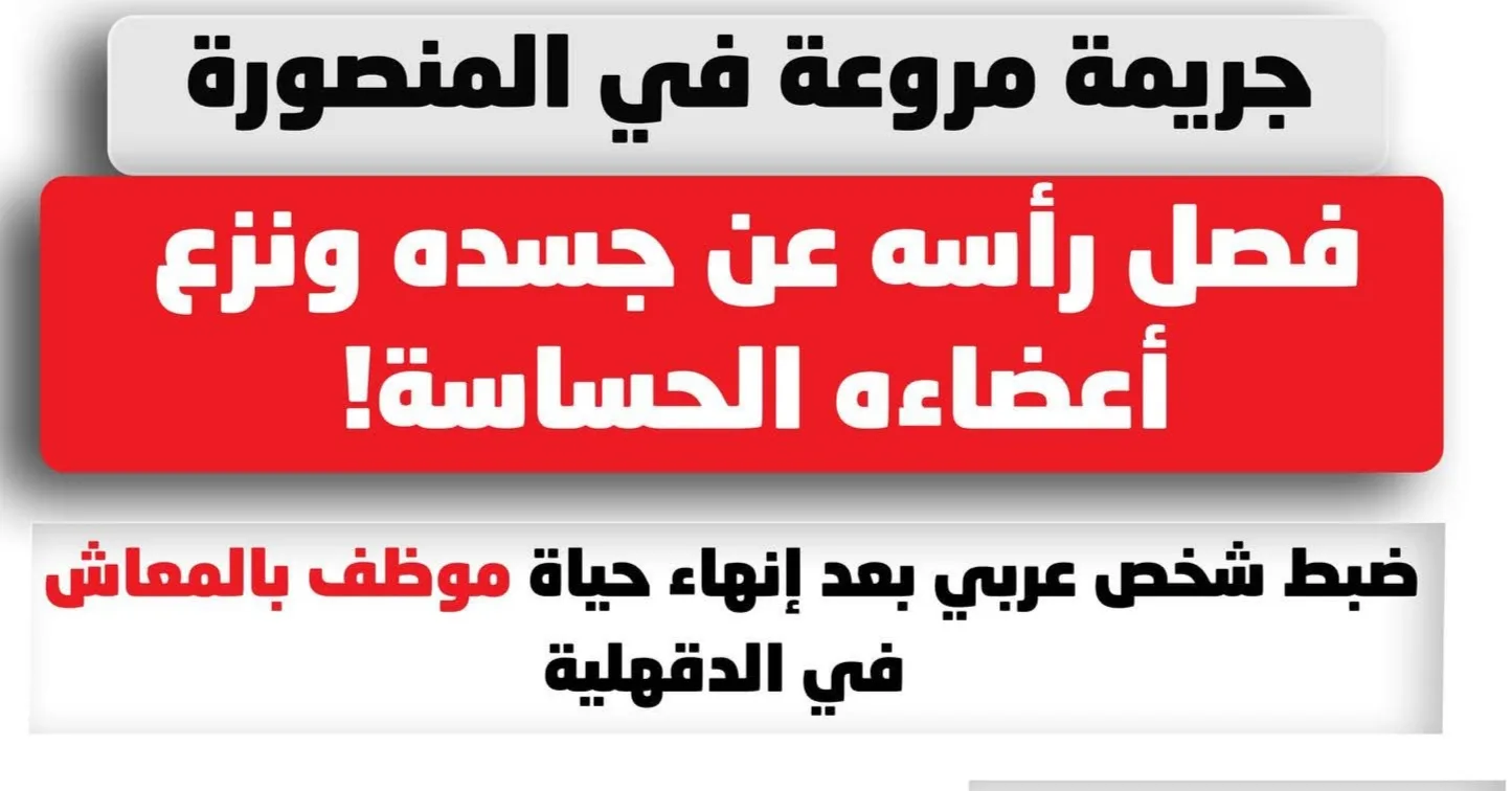 في جريمة مروعة هزت منطقة المنصورة المصرية أقدم مقيم من جنسية عربية بذبح شخص مصري وفصل رأسه عن جسده ونزع أعضائه الحساسة وتمكنت الأجهزة الأمنية والشرطية من القبض علي الجاني الذي نفذ جريمته تحت تأثير السُكر والمخدرات حيث إنهي حياة موظف بالمعاش في الدقهلية ذبحاً بسكين وذلك داخل مسكن الموظف بعمارة سكنية بشارع الجيش بالمنصورة حيث مثّل الجاني بجثة المجني عليه موضحاً أن جريمة قتله للموظف المصري جاءت بسبب مشادة ومشاجرة حادة بينهما انتهت بذبحه وفصل رأسه عن بقية جسده .