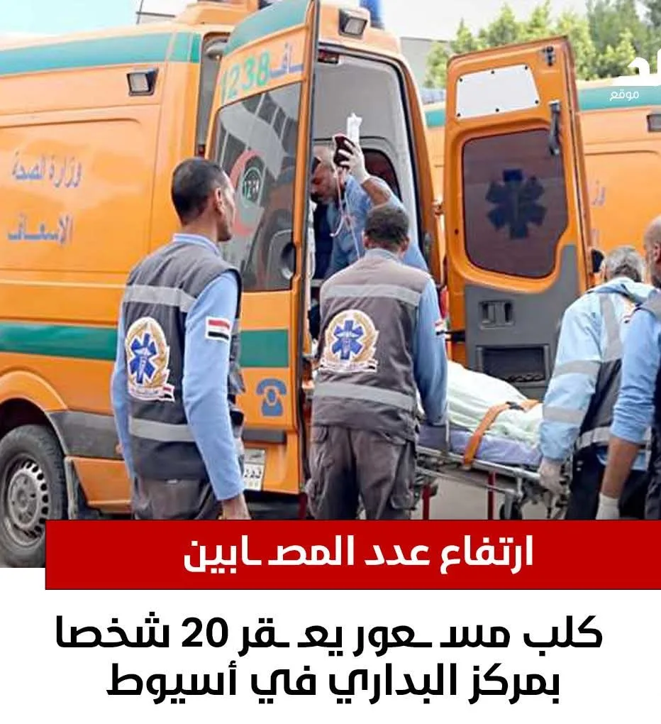 ارتفع عدد المصابين بـعقر كلب مسعور إلى 20 شخصًا، اليوم السبت، بقريتي العتمانية والنواورة بمركز البداري في أسيوط ، وتلقت السلطات المحلية في مدينة أسيوط المصرية بلاغاً من مستشفى النواورة المركزي بوصول 20 مصابًا من قريتي العتمانية والنواورة، جميعهم يعانون من إصابات متفرقة نتيجة عقر الكلب الضال الذي هاجم 20 شخصاً حيث تم إسعاف المصابين وإخضاعهم للعلاج بتقديم الإسعافات الأولية وإعطائهم أمصال السعر