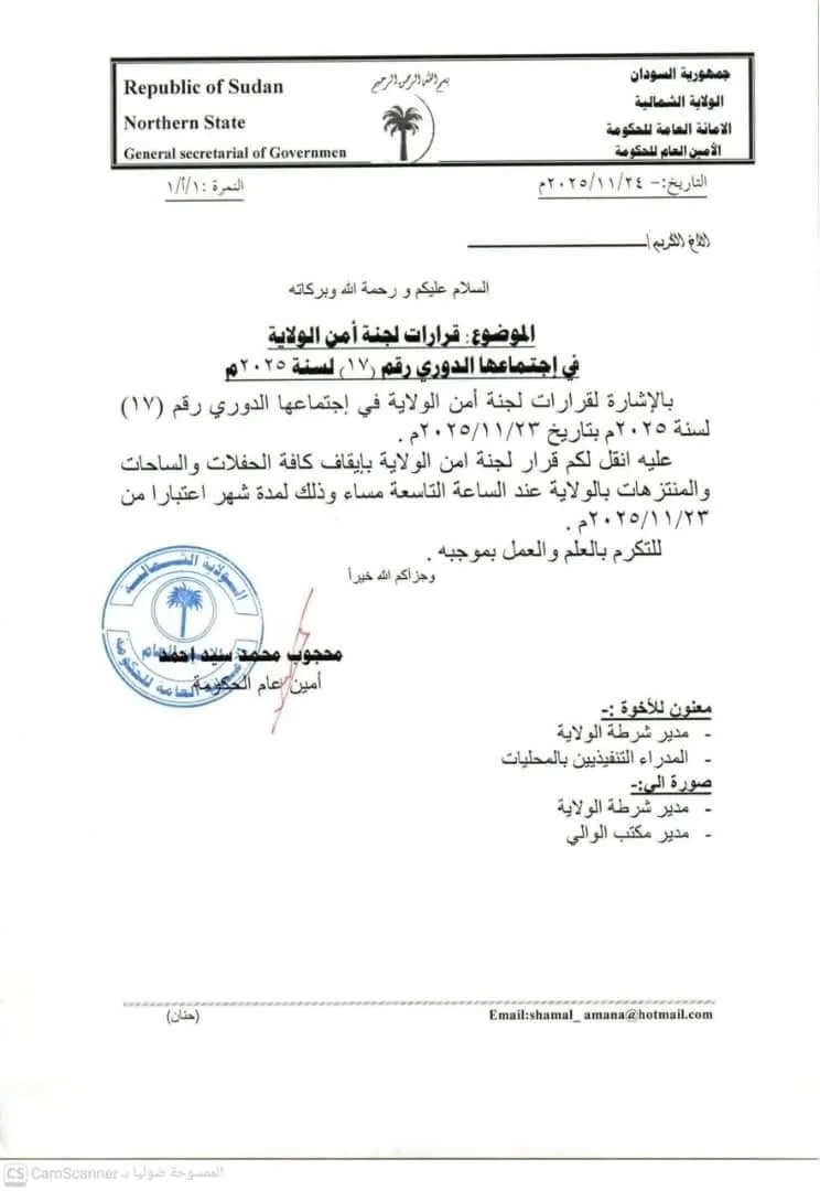 إيقاف الحفلات والمهرجانات من التاسعة مساء بالولاية الشمالية