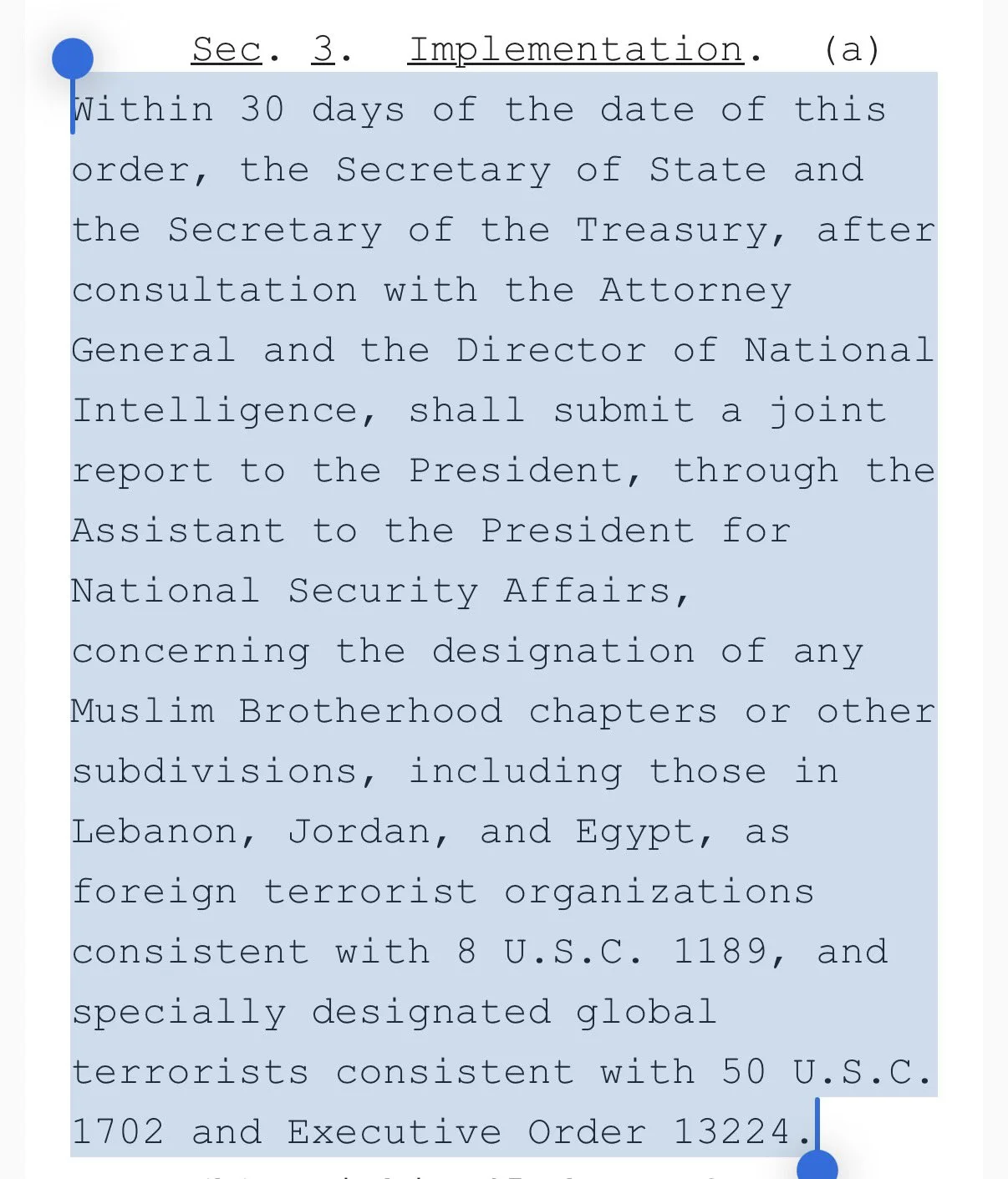 يوقع الرئيس الأمريكي دونالد ترامب اليوم علي قرار تنفيذي لإدراج بعض فروع جماعة الأخوان المسلمين كمنظمات إرهابية ويعطي القرار وزير الخارجية ووزير الخزانة مهلة “30 يوما”، بعد التشاور مع وزير العدل ومدير الاستخبارات الوطنية، لتقديم تقرير مشترك إلى الرئيس، بشأن تصنيف أي من فروع جماعة الإخوان المسلمين أو أي فروع تابعة لها، بما في ذلك تلك الموجودة في لبنان والأردن ومصر، كمنظمات إرهابية أجنبية .