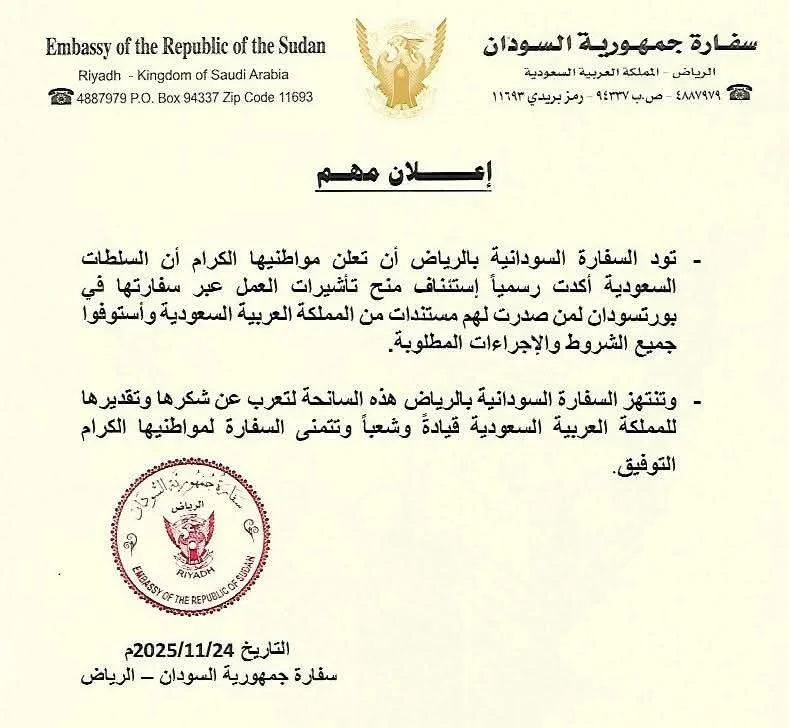 السفارة السودانية بالرياض: استئناف تأشيرات العمل بالسعودية في بورتسودان