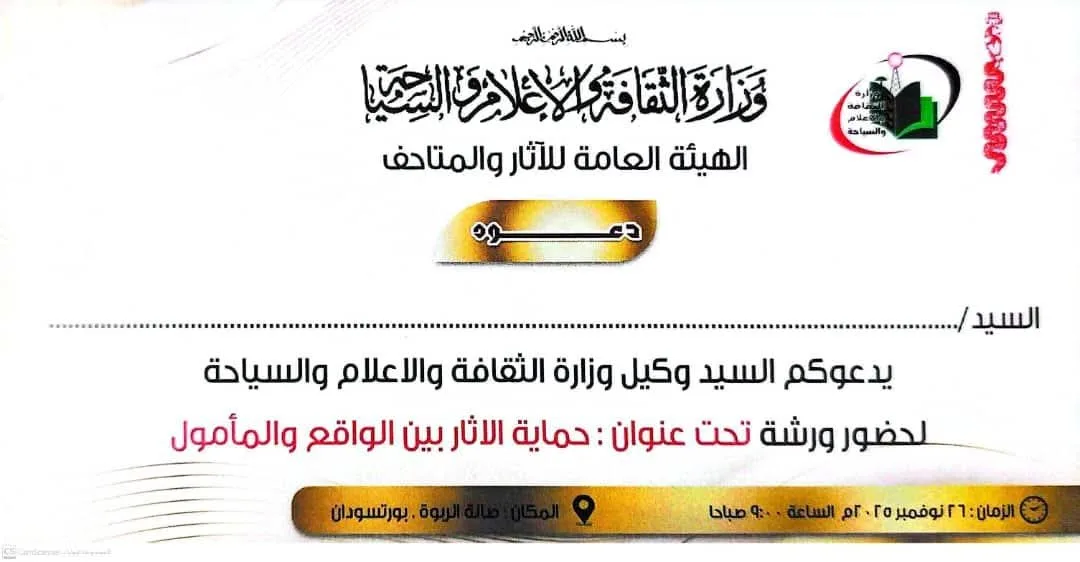 تعقد وزارة الثقافة والإعلام والسياحة في التاسعة من صباح غدا الأربعاء بقاعة الربوة ببورتسودان .. ورشة عمل بعنوان (حماية الآثار بين الواقع والمأمول) .. يخاطبها الوزير خالد علي الاعيسر ومدير الآثار والمتاحف د. غالية جار النبي .