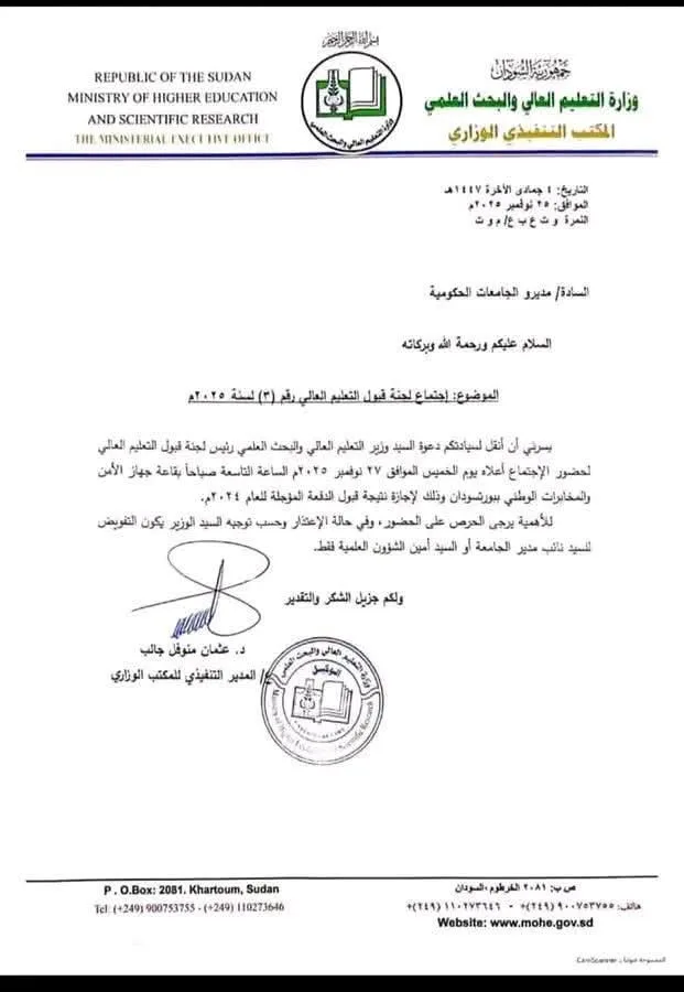 يترأس بروفيسور أحمد مضوي موسى وزير التعليم العالي والبحث العلمي يوم الخميس الموافق السابع والعشرين من نوفمبر الجاري اجتماع لجنة القبول بالوزارة وذلك بقاعة اجتماعات مركز الجامعة الوطنية ببورتسودان، لإجازة نتيجة القبول لمؤسسات التعليم العالي لطلاب الدفعة المؤجلة للعام 2024 م قبل إعلانها في مؤتمر صحفي تشارك فيه كافة وسائل الإعلام المرئية والمسموعة والإلكترونية، في تمام الساعة الثانية عشر ظهراً بالقاعة الرئيسة بمركز الجامعة الوطنية، وذلك بعد اكتمال كافة الترتيبات الفنية لإعلان النتيجة، وأكد بروفيسور مضوي أن الوزارة ظلت في عمل متواصل صباحاً ومساء حتى أصبحت النتيجة جاهزة وهيأت كل العوامل التي يمكن أن تساعد الطلاب في الحصول على نتيجة القبول عبر الرسائل النصية من جميع شبكات الاتصالات وعن طريق الموقع الرسمي للوزارة أو عبر الاتصال بمركز المرحوم عادل عبدالله موسى للاستجابة والدعم (الكول سنتر) .