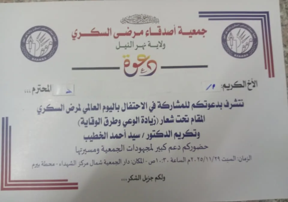 تنظم جمعية اصدقاء مرض السكري احتفالاً باليوم العالمي لمرض السكري المقام تحت شعار “زيادة الوعي وطرق الوقاية” وتكريم الدكتور سيد احمد الخطيب يوم السبت الساعة الواحدة والنصف ظهرا بدار الجمعية بعطبرة