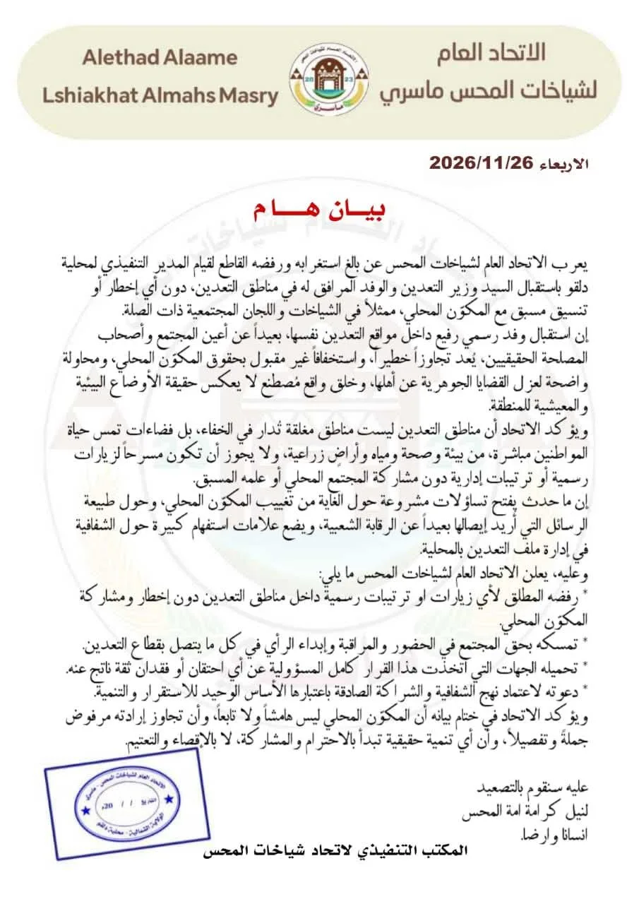 بيان الاتحاد العام لشياخات المحس حول زيارة وزير المعادن لمحلية دلقو