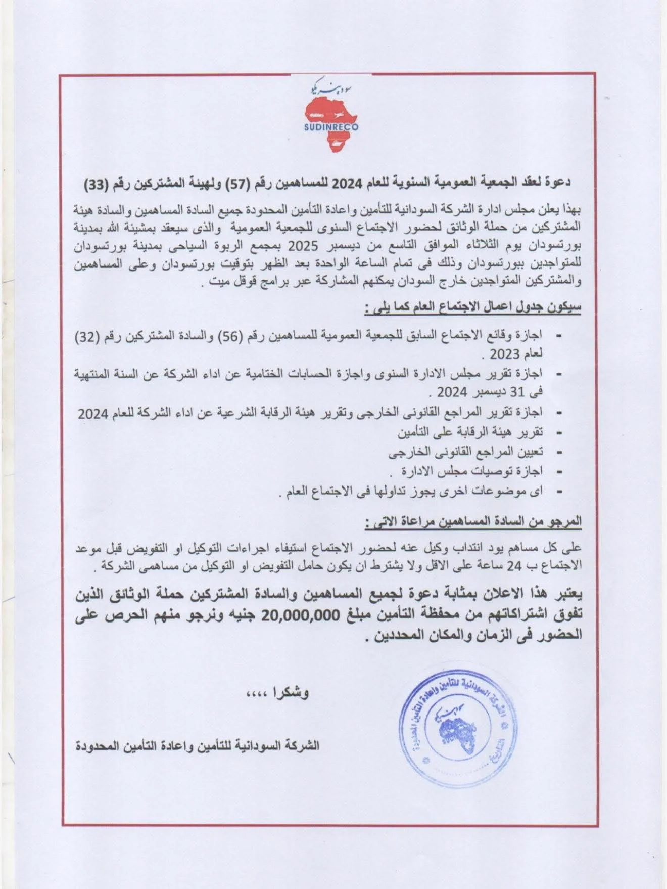 شركة السودان للتأمين تعقد إجتماع الجمعية العمومية في 9 ديسمبر ببورتسودان