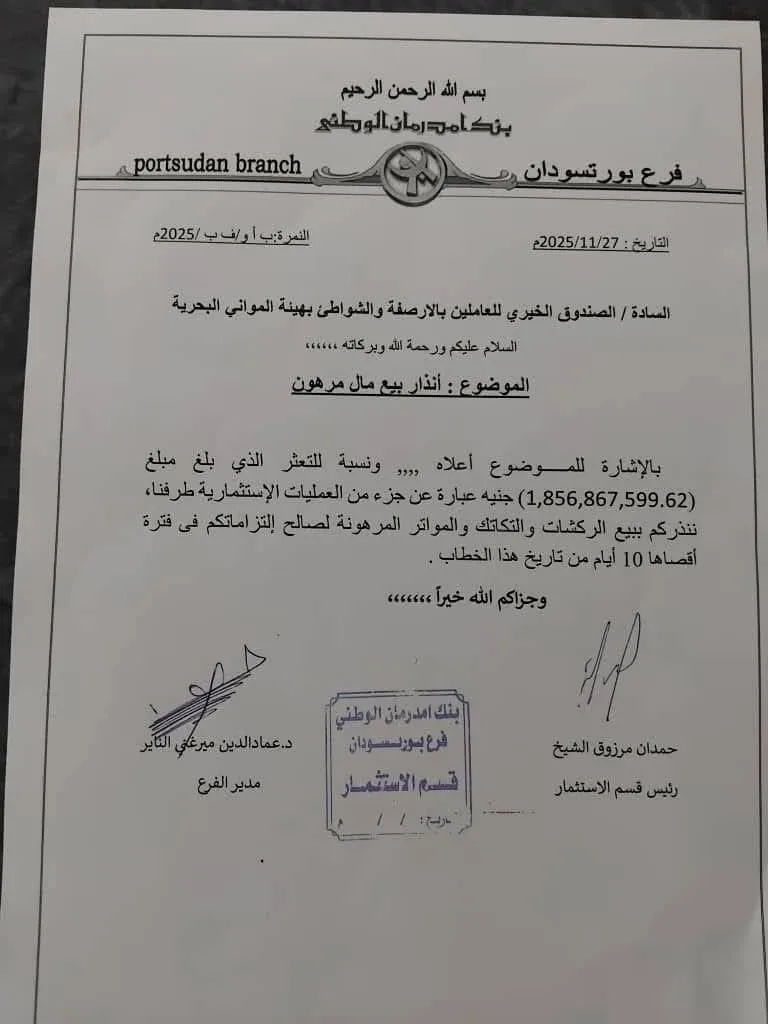 أصدر بنك امدرمان الوطني فرع بورتسودان إنذاراً أخيراً لإدارة الصندوق الخيري للعاملين في الموانئ البحرية بسحب وبيع الركشات والتكاتك والمواتر المرهونة لدي البنك نسبة للتعثر في سداد المبلغ المطلوب الذي يقدر بنحو (1،856،867،599،62) جنيهاً وعدم الالتزام من جانب الصندوق الخيري لعمال الأرصفة والإدارة العليا للمواني البحرية والإدارة المالية للمواني بالاتفاقيات المبرمة ما بين الصندوق وبنك امدرمان الوطني بالسداد للمبلغ المستحق مقابل العمليات الاستثمارية طرف البنك وأمهل البنك إدارة الصندوق الخيري للعاملين في الأرصفة والشواطئ فترة اقصاها 10 ايام من تاريخ الخطاب لسداد المبلغ ، وإلا سيضطر البنك لبيع المرهونات بطرفه.