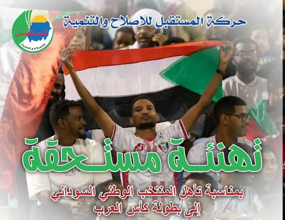 تتقدم حركة المستقبل للإصلاح و التنمية للمنتخب الوطني السوداني لكرة القدم و للأمة السودانية بأحر التهاني والتبريكات بمناسبة الفوز المستحق للمنتخب وتأهله التاريخي لبطولة كأس العرب ، ونفتخر بكم، ونتمنى لكم كل التوفيق في البطولات القادمة، لرفع اسم السودان عالياً في المحافل العربية والدولية ، الأمام ، كما نتقدم بالشكر إلى الجالية السودانية في قطر و كل الأمة السودانية في الداخل والخارج على التشجيع الكبير و التضامن القوي مع ممثل السودان ، حيث أثبتم بهذا الموقف أن الأمة السودانية قادرة على خوض التحديات و صناعة الفرح مهما كانت الظروف