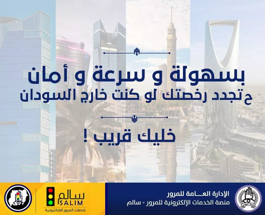 أعلنت شرطة مرور السودان أن يوم غد السبت سيشهد تدشين تطبيق سالم لخدمات المرور الإلكترونية مؤكدة أنها ستطلق الخدمة الإلكترونية لتجديد رخص قيادات السيارات للسودانيين في دول المهجر