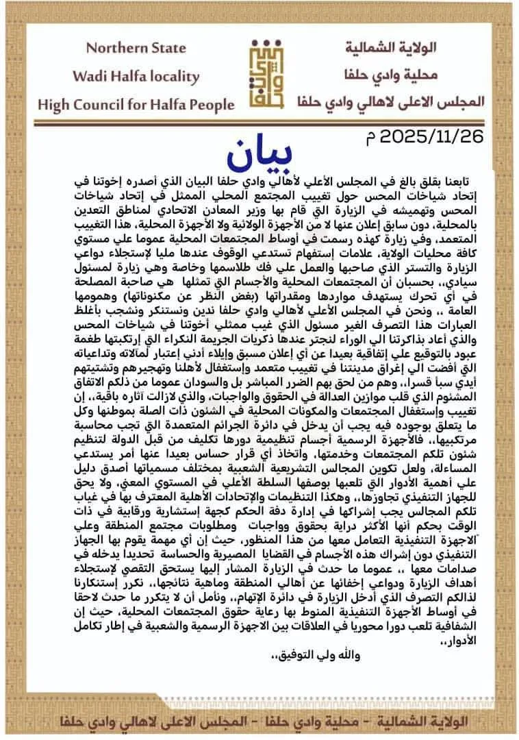 أصدر المجلس الأعلي لأهالي وادي حلفا بياناً تضامن فيه مع إتحاد شياخات المحس مطالباً بفك غموض زيارة وزير المعادن نور الدائم طه والوفد المرافق له لمحلية دلقو وتغييب المكون المحلي وفيما يلي نص البيان.