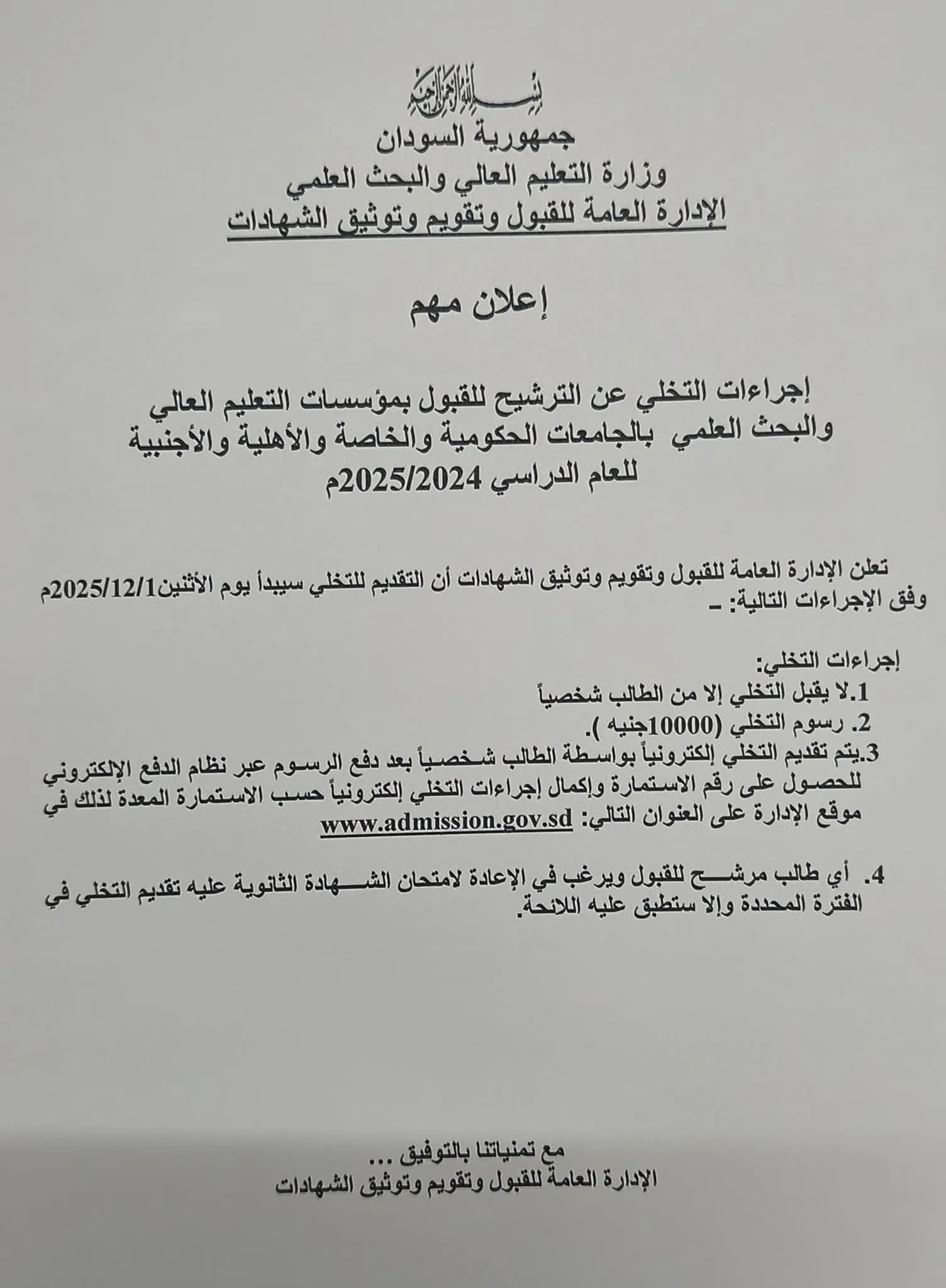 أعلنت الإدارة العامة للقبول وتقويم وتوثيق الشهادات بوزارة التعليم العالي والبحث العلمي عن بدء إجراءات التخلي عن الترشيح للقبول في مؤسسات التعليم العالي الحكومية والخاصة والأهلية والأجنبية للعام الدراسي 2024/2025، وذلك اعتباراً من يوم غد الاثنين 1 ديسمبر 2025م، وأكدت الإدارة أن التقديم للتخلي يتم إلكترونيا بواسطة الطالب شخصياً، بعد سداد الرسوم المقررة والبالغة 10,000 جنيه سوداني عبر نظام الدفع الإلكتروني، ليتمكن الطالب من الحصول على رقم الاستمارة ومتابعة إكمال جميع الإجراءات عبر الاستمارة الإلكترونية المعدة لهذا الغرض في موقع الإدارة على العنوان: