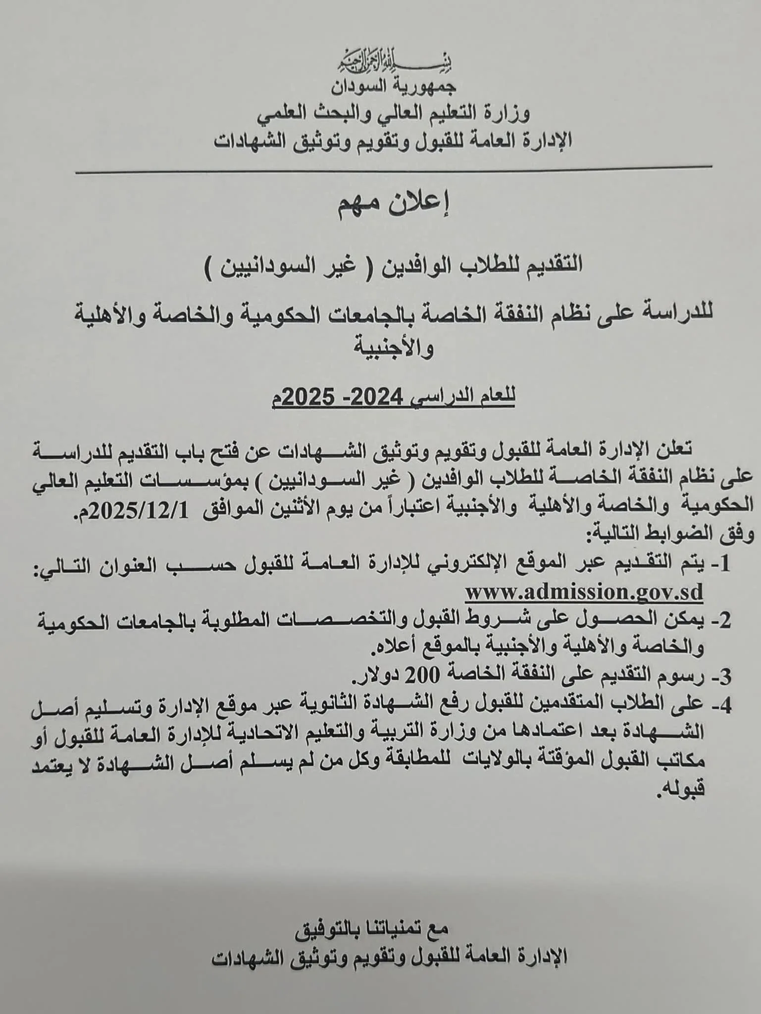 أعلنت الإدارة العامة للقبول وتقويم وتوثيق الشهادات عن فتح باب التقديم للطلاب الوافدين غير السودانيين للدراسة على نظام النفقة الخاصة بمؤسسات التعليم العالي الحكومية والخاصة والأهلية والأجنبية للعام الدراسي 2024– 2025م، اعتباراً من يوم غدٍ الاثنين 1 ديسمبر 2025م. وأوضحت الإدارة أنه يمكن للطلاب التقديم عبر الموقع الإلكتروني للإدارة العامة للقبول على العنوان
