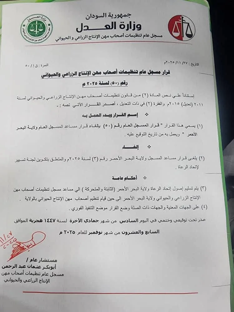 هدد إتحاد رعاة ومنتجي الثروة الحيوانية بولاية البحر الأحمر بالتصعيد وتتريس الطرقات في حال إستمرار التغول علي حقوقهم من قبل مسجل عام تنظيمات أصحاب مهن الإنتاج الحيواني والزراعي وقال الإتحاد إن حقوقهم أصبحت مهدرة بعد قرار مسجل تنظيمات أصحاب مهن الإنتاج الحيواني والزراعي الذي ألغي قرار قيام الجمعية العمومية وتكوين لجنة تسيير وناشد الإتحاد الجهات العليا في الدولة للتدخل من أجل إنصافهم ورد حقوقهم ومنع تغول المسجل علي مكتسباتهم، هذا وقدر أصدر المسجل العام لتنظيمات اصحاب مهن الانتاج الزراعي والحيواني قراراً بالغاء قرار مساعد مسجل ولاية البحر الاحمر السابق الذي وافق علي قيام الجمعية العمومية وعلي تكوين لجنة تسيير لاتحاد جمعيات الانتاج الحيواني بالبحر الأحمر تمهيداً لإستلام أموال وممتلكات وعهد الاتحاد ، إلا أن قرار المسجل ألغي القرار السابق وأمر بتسليم كل الممتلكات والأصول الثابتة والمتحركة إلي مساعد المسجل البحر الأحمر .