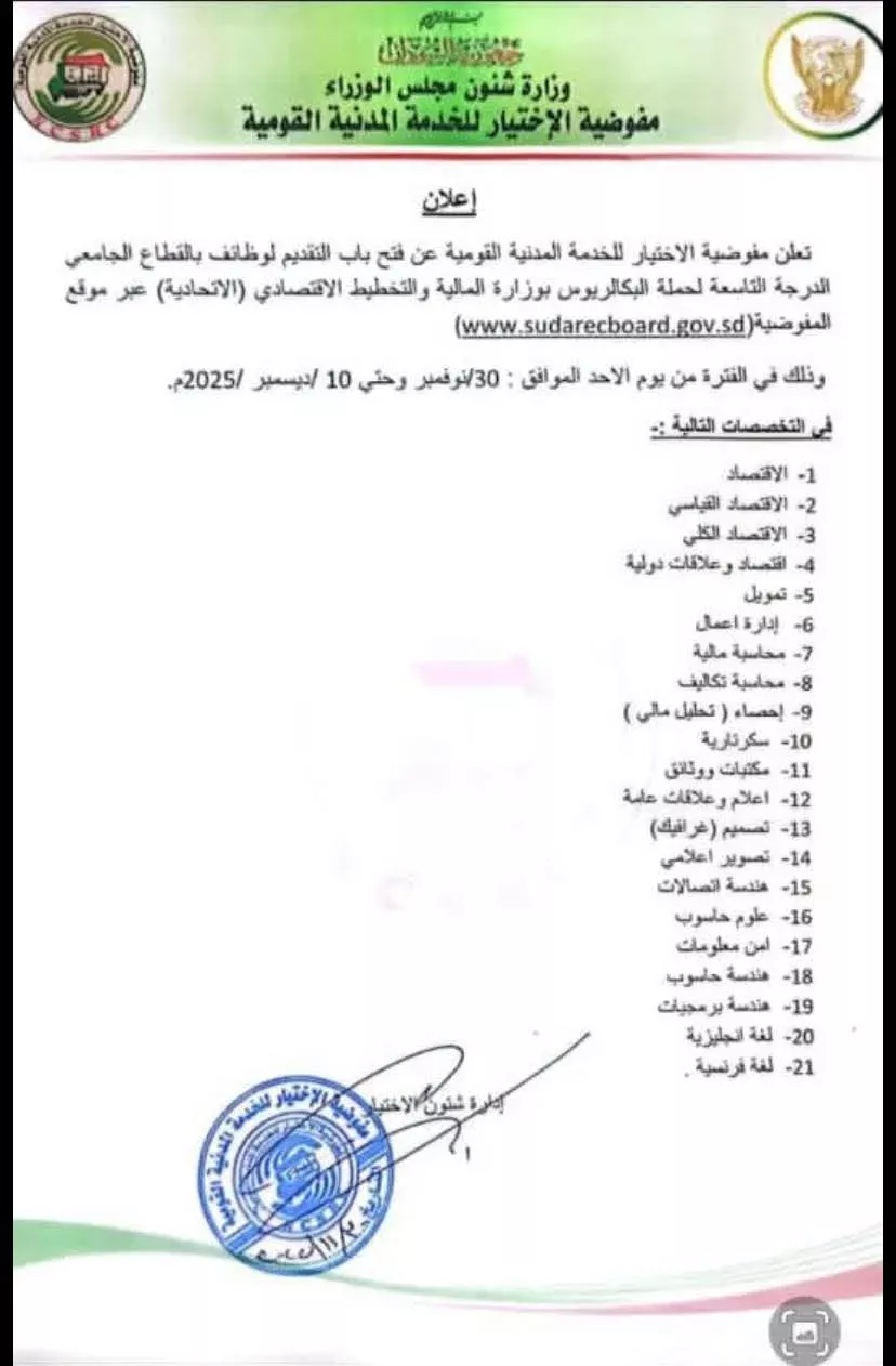 أعلنت مفوضية الاختيار للخدمة المدنية القومية عن فتح باب التقديم لوظائف القطاع الجامعي بالدرجة التاسعة لحملة البكالوريوس بوزارة المالية والتخطيط الاقتصادي (الاتحادية)، اعتباراً من الأحد 30 نوفمبر وحتى 10 ديسمبر 2025م ، وأوضحت المفوضية أن الوظائف متاحة في تخصصات متعددة تشمل الاقتصاد، الاقتصاد القياسي، الاقتصاد الكلي، الاقتصاد وعلاقات دولية، التمويل، إدارة الأعمال، المحاسبة المالية، محاسبة التكاليف، الإحصاء والتحليل المالي، السكرتارية، المكتبات والتوثيق، الإعلام والعلاقات العامة، التصميم غير الفني، التصوير الإعلامي، هندسة الاتصالات، علوم الحاسوب، أمن المعلومات، هندسة الحاسوب، هندسة البرمجيات، اللغة الإنجليزية واللغة الفرنسية، ودعت المفوضية الراغبين للتقديم عبر موقعها الإلكتروني: