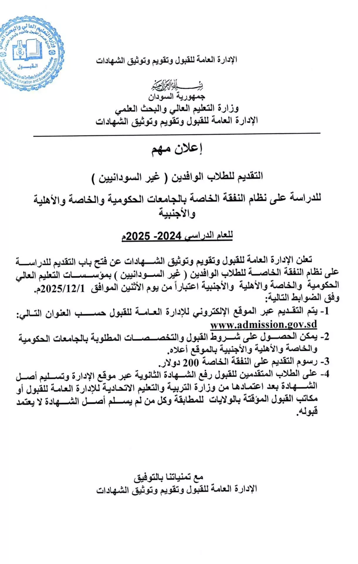 أعلنت الإدارة العامة للقبول وتقويم وتوثيق الشهادات عن فتح باب التقديم للطلاب الوافدين غير السودانيين للدراسة على نظام النفقة الخاصة بمؤسسات التعليم العالي الحكومية والخاصة والأهلية والأجنبية للعام الدراسي 2024– 2025، اعتباراً من يوم الاثنين الموافق 1 ديسمبر 2025م. وأوضحت الإدارة أنه يمكن للطلاب التقديم عبر الموقع الإلكتروني للإدارة العامة للقبول على العنوان