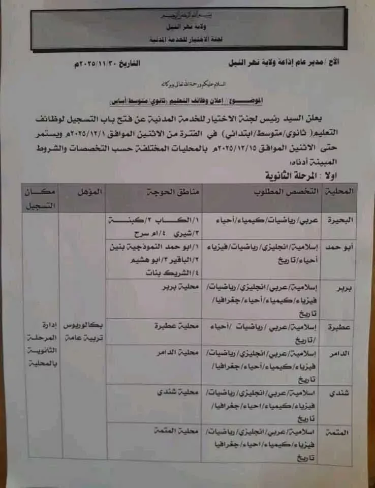 أعلنت لجنة الاختيار للخدمة المدنية بولاية نهر النيل عن فتح باب التسجيل والتقديم لوظائف التعليم في المراحل الدراسية المختلفة (ثانوي/ متوسط/ ابتدائي) ، وذلك في الفترة من اليوم الاثنين  الأول من ديسمبر حتى الاثنين الخامس عشر من العام 2025م بالمحليات المختلفة حسب التخصصات والشروط المبينة بجداول الإعلان المرفقة.