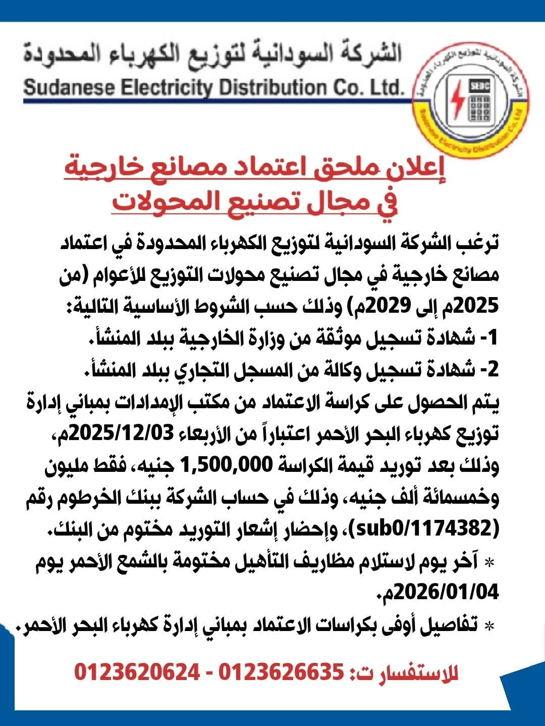 الرئيسية/اقتصاد/الشركة السودانية لتوزيع الكهرباء تعلن عن رغبتها في اعتماد مصانع خارجية في مجال تصنيع المحولات اقتصاد أخر الأخبار الشركة السودانية لتوزيع الكهرباء تعلن عن رغبتها في اعتماد مصانع خارجية في مجال تصنيع المحولات Alhadiمنذ أسبوعين0 216 أقل من دقيقة الوسوم# شركة الكهرباء نسخ الرابط تم نسخ الرابط Alhadiمنذ أسبوعين0 216 أقل من دقيقة شاركها فيسبوك X ماسنجر ماسنجر واتساب تيلقرام