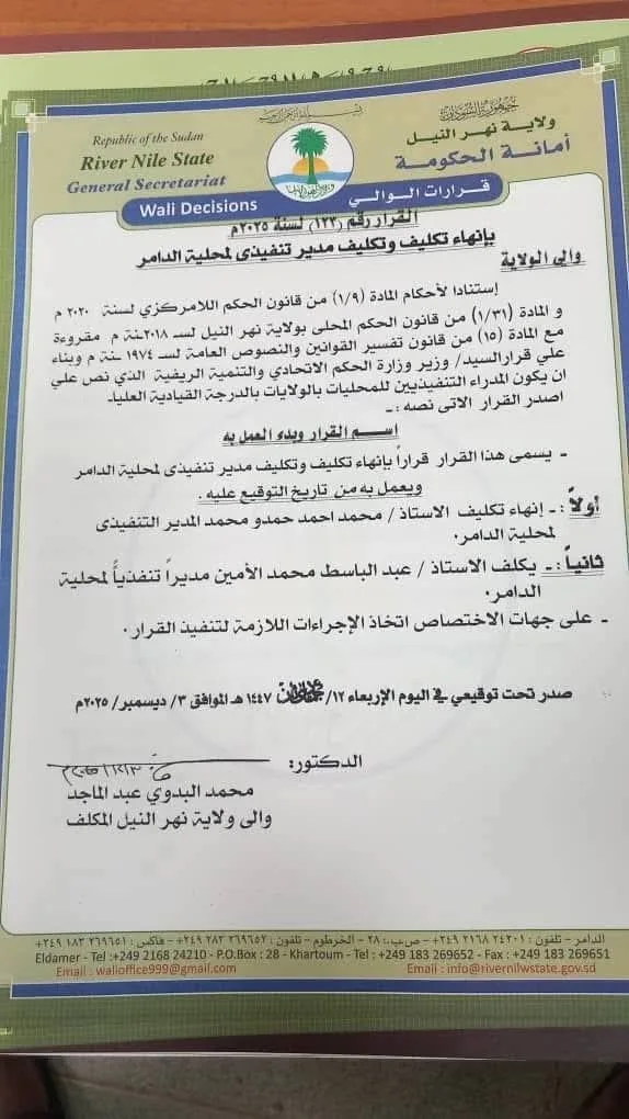 أصدر والي نهر النيل قراراً بإعفاء المدير التنفيذي لمحلية الدامر محمد أحمد حمدو وتعيين عبد الباسط محمد الأمين مديراً تنفيذياً جديداً للمحلية ، وتم تعيين المدير التنفيذي المُقال محمد أحمد حمدو كمدير تنفيذي للدامر في مارس الماضي.
