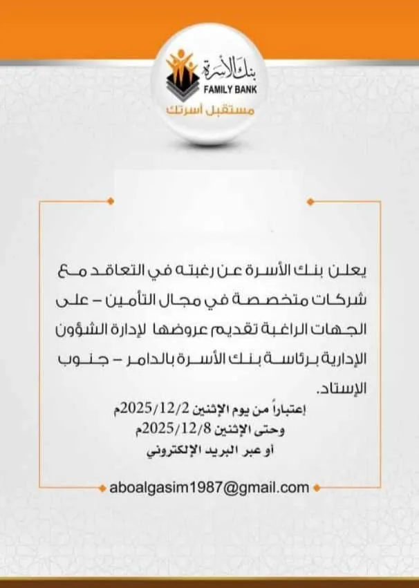 أعلن بنك الأسرة عن رغبته في التعاقد مع شركات متخصصة في مجال التأمين داعياً الجهات الراغبة تقديم عروضها إلى إدارة الشؤون الإدارية رئاسة بنك الأسرة بالدامر جنوب الاستاد، وذلك اعتبارًا من يوم أمس الثلاثاء 3 ديسمبر الي 8 ديسمبر الجاري ، او عبر البريد الإلكتروني التالي : aboalgasim1987@gmail.com