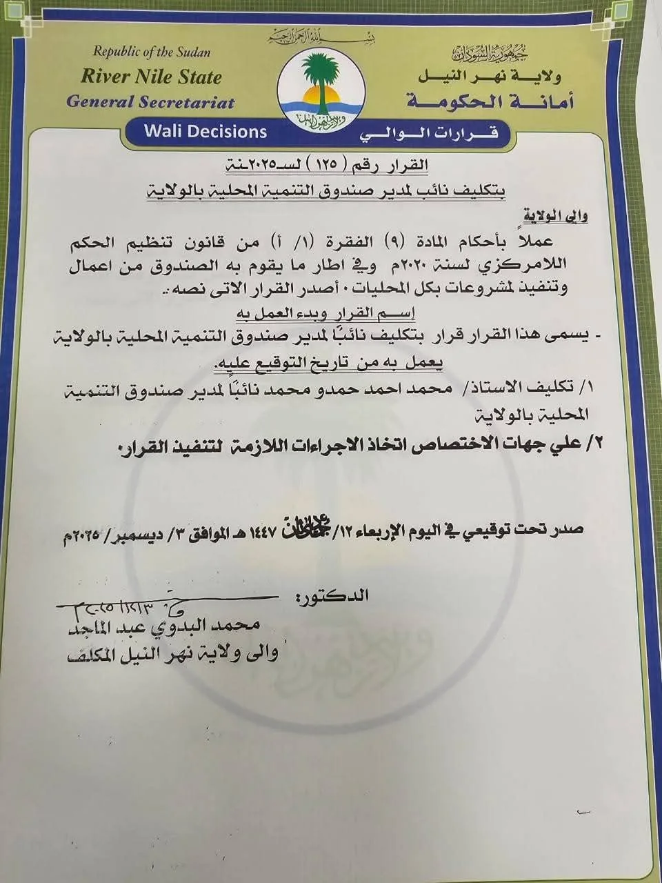 أصدر والي نهر النيل محمد البدوي عبد الماجد قراراً بتعيين محمد أحمد حمدو نائباً لمدير صندوق التنمية المحلية بنهر النيل ، وعمل حمدو مديراً تنفيذياً لمحلية الدامر لمدة 8 أشهر حيث تم إعفاءه اليوم الأربعاء 3 ديسمبر وتعيين عبد الباسط محمد الأمين خلفاً له ليكون حمدو نائباً لعوض الكريم علي المبارك مدير صندوق التنمية المحلية بالولاية.