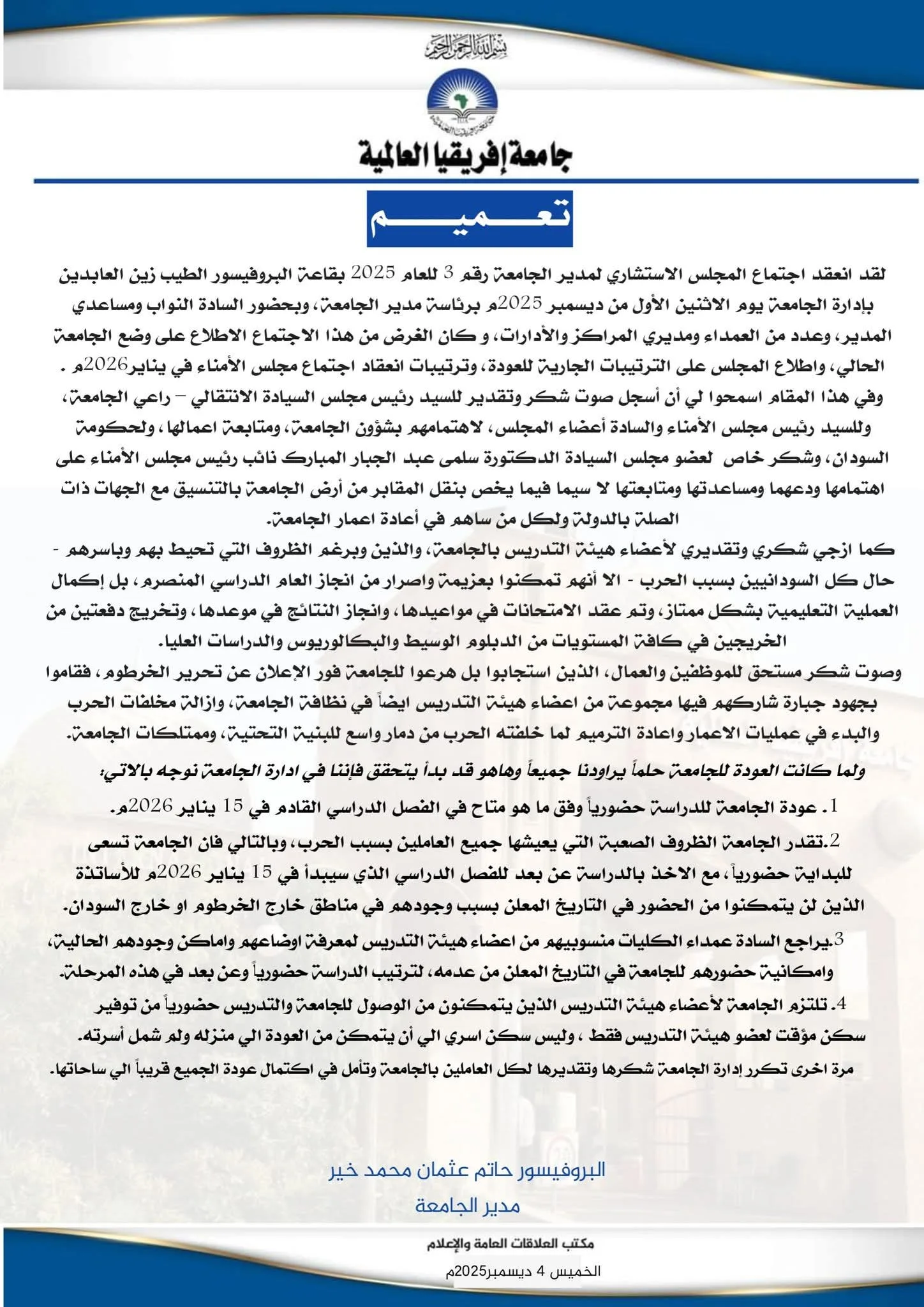 أعلنت جامعة إفريقيا العالمية عودتها للدراسة حضورياً من مقرها بالخرطوم إعتباراً من 15 يناير المقبل وفق ما هو في الفصل الدراسي الأول مع توفر إمكانية الدراسة عن بُعد للأساتذة الذين لن يتمكنوا من الحضور في التاريخ المعلن بسبب وجودهم في مناطق خارج الخرطوم او خارج السودان وقالت الجامعة في بيان صادر عن الإدارة عقب إنعقاد مجلسها الإستشاري إلتزام الجامعة لأعضاء هيئة التدريس الذين يتمكنون من الوصول للجامعة والتدريس حضورياً من توفير سكن مؤقت لعضو هيئة التدريس فقط ، وليس سكن اسري الي أن يتمكن من العودة الي منزله ولم شمل أسرته ، وانعقد اجتماع المجلس الاستشاري لمدير الجامعة رقم 3 للعام 2025 بقاعة البروفيسور الطيب زين العابدين بإدارة الجامعة يوم الاثنين الأول من ديسمبر 2025م برئاسة مدير الجامعة، وبحضور السادة النواب ومساعدي المدير، وعدد من العمداء ومديري المراكز والأدارات، حيث كان الغرض من الاجتماع الاطلاع على وضع الجامعة الحالي، واطلاع المجلس على الترتيبات الجارية للعودة، وترتيبات انعقاد اجتماع مجلس الأمناء في يناير 2026م وخلال الإجتماع سجل مدير الجامعة البروفسير حاتم عثمان محمد خير صوت شكر لرئيس مجلس السيادة الانتقالي – راعي الجامعة، ولرئيس مجلس الأمناء عبد الرحمن بن عبد الله الزيد وأعضاء المجلس، لاهتمامهم بشؤون الجامعة، ومتابعة اعمالها، ولحكومة السودان، وعضو مجلس السيادة الدكتورة سلمى عبد الجبار المبارك نائب رئيس مجلس الأمناء على اهتمامها ودعهما ومساعدتها ومتابعتها لا سيما فيما يخص بنقل المقابر من أرض الجامعة بالتنسيق مع الجهات ذات الصلة بالدولة ولكل من ساهم في أعادة اعمار الجامعة ، وتقدم مدير الجامعة بشكره لأعضاء هيئة التدريس بالجامعة، والذين وبرغم الظروف التي تحيط بهم وباسرهم – حال كل السودانيين بسبب الحرب – الا أنهم تمكنوا بعزيمة واصرار من انجاز العام الدراسي المنصرم، بل إكمال العملية التعليمية بشكل ممتاز، وتم عقد الامتحانات في مواعيدها، وانجاز النتائج في موعدها، وتخريج دفعتين من الخريجين في كافة المستويات من الدبلوم الوسيط والبكالوريوس والدراسات العليا، وقدم مدير الجامعة شكراً مستحقاً للموظفين والعمال، الذين استجابوا بل هرعوا للجامعة فور الإعلان عن تحرير الخرطوم، فقاموا بجهود جبارة شاركهم فيها مجموعة من اعضاء هيئة التدريس ايضاً في نظافة الجامعة، وازالة مخلفات الحرب والبدء في عمليات الاعمار واعادة الترميم لما خلفته الحرب من دمار واسع للبنية التحتية، وممتلكات الجامعة.