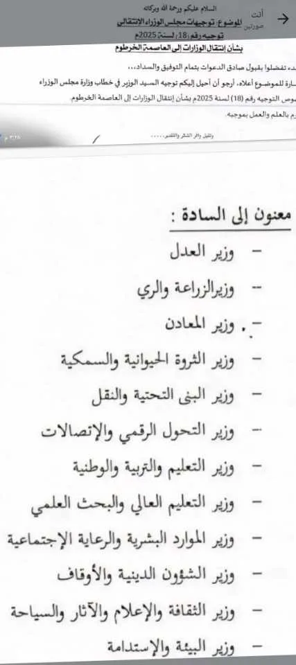 وجّه مجلس الوزراء الانتقالي، عبر تعميم رسمي صادر بالرقم (18) لسنة 2025، الوزارات المعنية بالشروع في ترتيبات انتقالها من العاصمة الإدارية المؤقتة في بورتسودان إلى العاصمة الخرطوم، وذلك وفق خطاب رسمي أحالته الأمانة العامة لمجلس الوزراء إلى عدد من الوزراء، وطالب الخطاب – الذي وُجّه لوزراء (العدل، الزراعة والري، المعادن، الثروة الحيوانية والسمكية، البنى التحتية والنقل، التحول الرقمي والاتصالات، التربية والتعليم، التعليم العالي والبحث العلمي، الموارد البشرية والرعاية الاجتماعية، الشؤون الدينية والأوقاف، الثقافة والإعلام والآثار والسياحة، والبيئة والاستدامة) – بالعلم واتخاذ ما يلزم من إجراءات، تمهيداً لمغادرة بورتسودان والتوجه لمباشرة التكاليف والمهام والأعمال من العاصمة الخرطوم ، وأكد المجلس في تعميمه أهمية الالتزام بتوجيهات رئيس الوزراء بشأن مباشرة عملية الانتقال إلى الخرطوم، واستكمال الجوانب الإدارية والفنية المتعلقة بذلك ، وعلمت (صباح نيوز) من مصادر خاصة أن الوزارات المعنية قررت عدم تجديد إيجارات مقراتها في بورتسودان بنهاية العام الجاري مع إخلاء جميع المباني الحكومية المؤقتة قبل مطلع يناير المقبل.