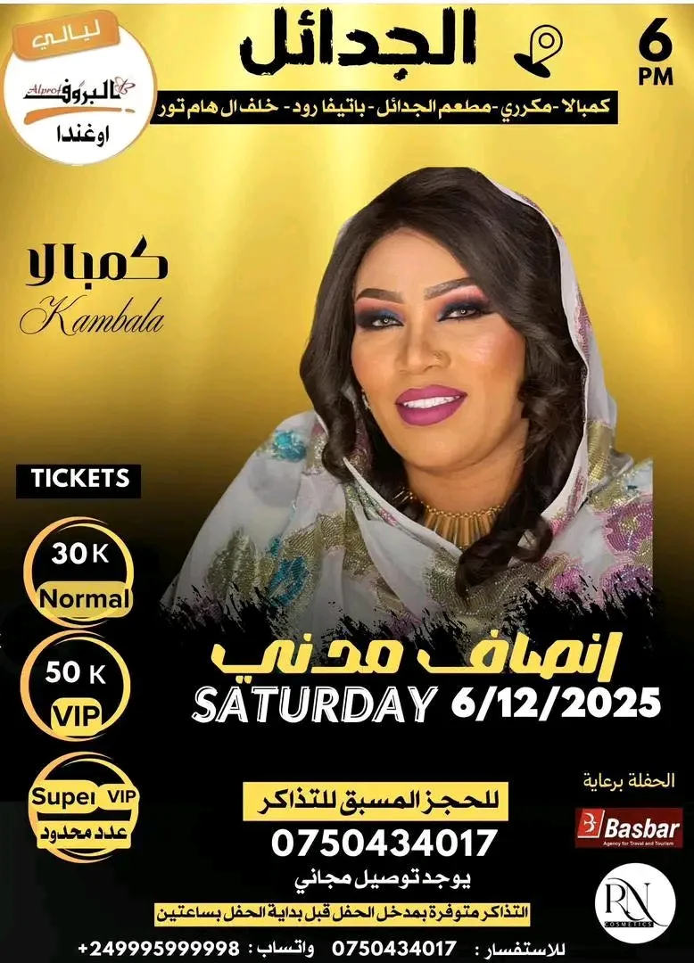 تستعد “ليالي البروف” لتنظيم حفل جماهيري ضخم بمنتجع ومطعم الجدائل في العاصمة الأوغندية كمبالا، تحييه الفنانة إنصاف مدني التي وصلت كمبالا اليوم استعداداً لإحياء السهرة التي وُصفت بأنها ستكون من أكبر الفعاليات الفنية خلال الموسم.