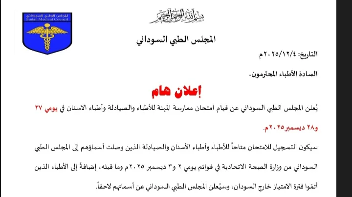 أعلن المجلس الطبي السوداني يعلن عن قيام امتحان ممارسة المهنة للأطباء والصيادلة وأطباء الاسنان في يومي 27 و 28 ديسمبر الجاري للأطباء وأطباء الأسنان والصيادلة الذين وصلت أسماؤهم إلى المجلس الطبي من وزارة الصحة الاتحادية في قوائم يومي 2 و 3 ديسمبر 2025م وما قبله ، اضافة للاطباء الذين أتمّوا فترة الامتياز خارج السودان، وسيُعلن المجلس الطبي السوداني عن أسمائهم لاحقا ويبلغ عدد الجالسين للإمتحان الذين وصلت أسماؤهم 983 بواقع, 646 طبيب بشري، 221 صيادلة و 116 أسنان .