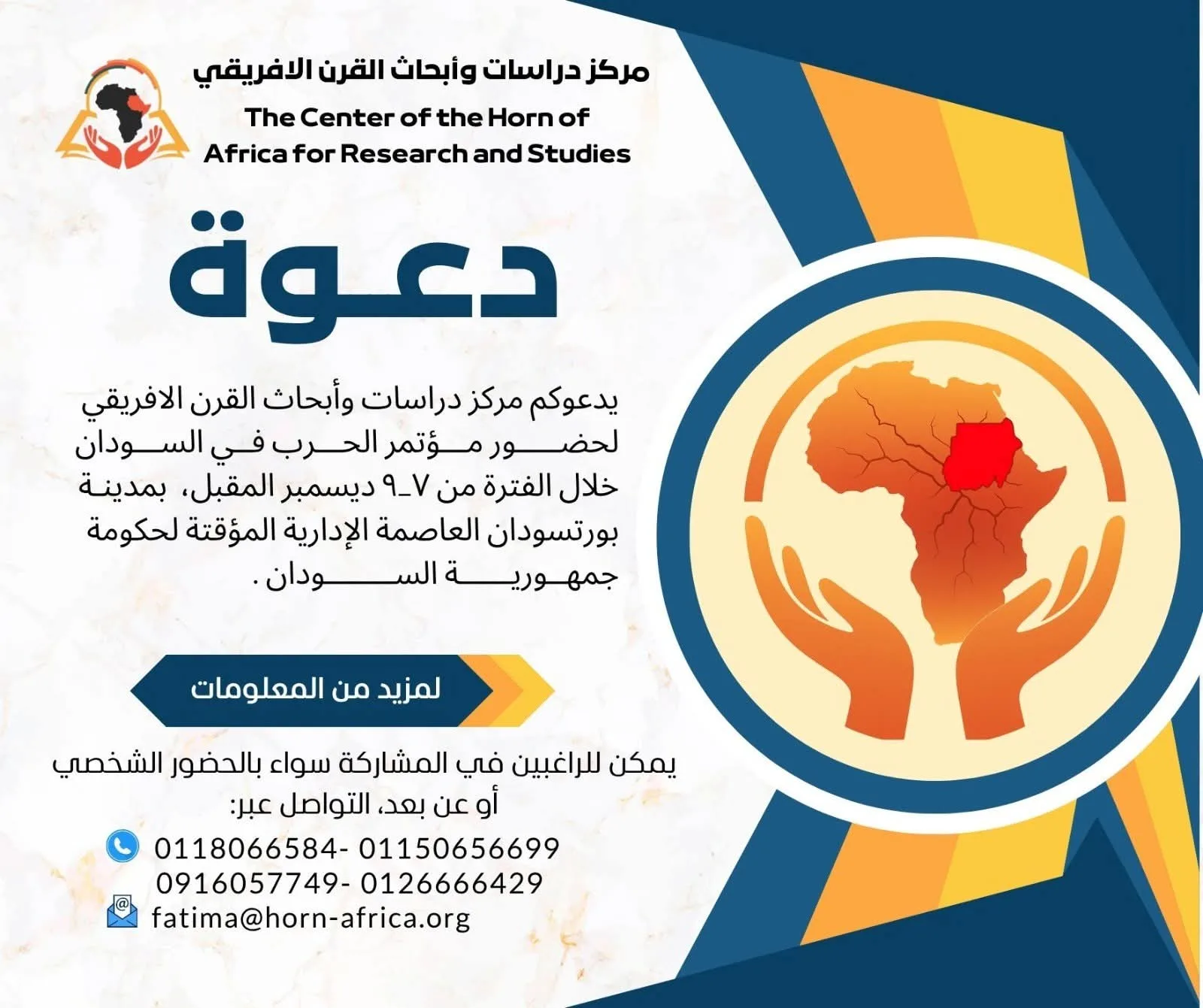 ينظم مركز دراسات وأبحاث القرن الأفريقي مؤتمر الحرب في السودان يوم الأحد المقبل ويستمر لمدة 3 ايام ، تقدم أوراق عن أسباب الحرب والحل.،وتأثيرها على الداخل والخارج وذلك بقاعة الشمندورة في بورتسودان.