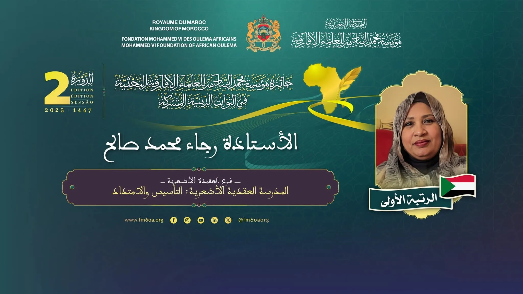 أعلنت مؤسسة محمد السادس العلماء الأفارقة عن فوز الباحثة السودانية رجاء محمد صالح وحصولها علي المركز الأول في مسابقة المؤسسة عبر بحثها في العقيدة الأشعرية وحصول المتسابق السوداني أحمد محمد زين الخضر علي المرتبة الثانية في مجال الثوابت الدينية المشتركة صنف إمارة المؤمنين.