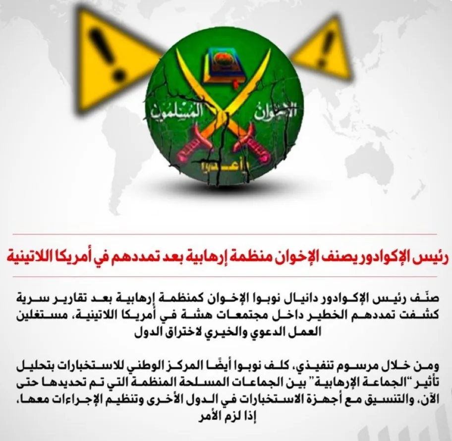 بعد تقارير استخباراتية كشفت عن تمددهم داخل مجتمعات في أمريكا اللاتينية عبر عدد من الأذرع السرية والواجهات الخيرية والمجتمعية أعلن رئيس الأكوادور دانيال نويبا تصنيف جماعة الأخوان المسلمين كمنظمة إرهابية وإدراجها علي اللائحة السوداء ، ووجّه بتحليل نشاط جماعاتهم المسلحة واتخاذ إجراءات دولية ضدهم إذا لزم الأمر.