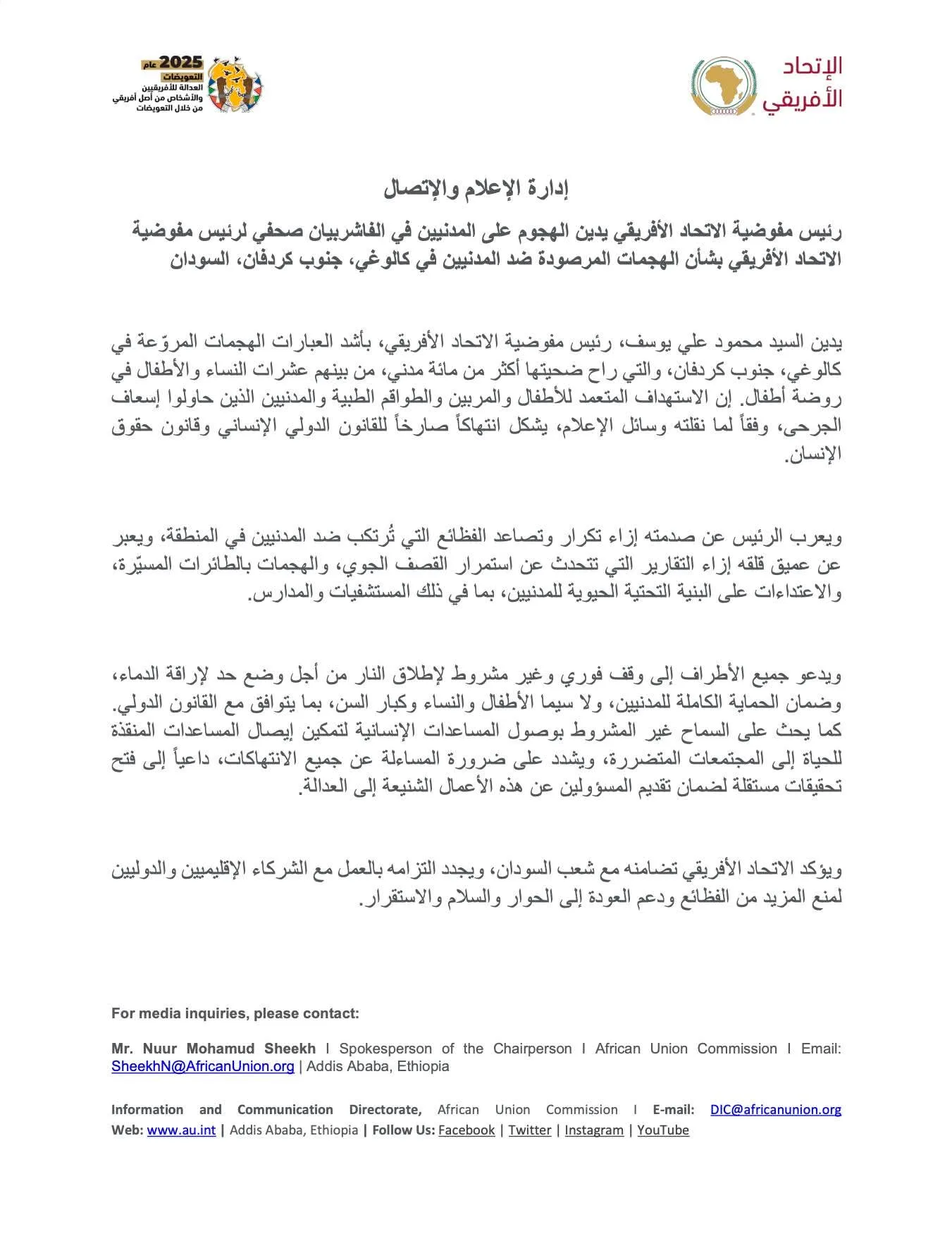 يدين السيد محمود علي يوسف، رئيس مفوضية الاتحاد الأفريقي، بأشد العبارات الهجمات المروّعة في كالوغي، جنوب كردفان، والتي راح ضحيتها أكثر من مائة مدني، من بينهم عشرات النساء والأطفال في روضة أطفال. إن الاستهداف المتعمد للأطفال والمربين والطواقم الطبية والمدنيين الذين حاولوا إسعاف الجرحى، وفقاً لما نقلته وسائل الإعلام، يشكل انتهاكاً صارخاً للقانون الدولي الإنساني وقانون حقوق الإنسان ، ويعرب الرئيس عن صدمته إزاء تكرار وتصاعد الفظائع التي تُرتكب ضد المدنيين في المنطقة، ويعبر عن عميق قلقه إزاء التقارير التي تتحدث عن استمرار القصف الجوي، والهجمات بالطائرات المسيّرة، والاعتداءات على البنية التحتية الحيوية للمدنيين، بما في ذلك المستشفيات والمدارس ، ويدعو جميع الأطراف إلى وقف فوري وغير مشروط لإطلاق النار من أجل وضع حد لإراقة الدماء، وضمان الحماية الكاملة للمدنيين، ولا سيما الأطفال والنساء وكبار السن، بما يتوافق مع القانون الدولي، كما يحث على السماح غير المشروط بوصول المساعدات الإنسانية لتمكين إيصال المساعدات المنقذة للحياة إلى المجتمعات المتضررة، ويشدد على ضرورة المساءلة عن جميع الانتهاكات، داعياً إلى فتح تحقيقات مستقلة لضمان تقديم المسؤولين عن هذه الأعمال الشنيعة إلى العدالة ، ويؤكد الاتحاد الأفريقي تضامنه مع شعب السودان، ويجدد التزامه بالعمل مع الشركاء الإقليميين والدوليين لمنع المزيد من الفظائع ودعم العودة إلى الحوار والسلام والاستقرار.